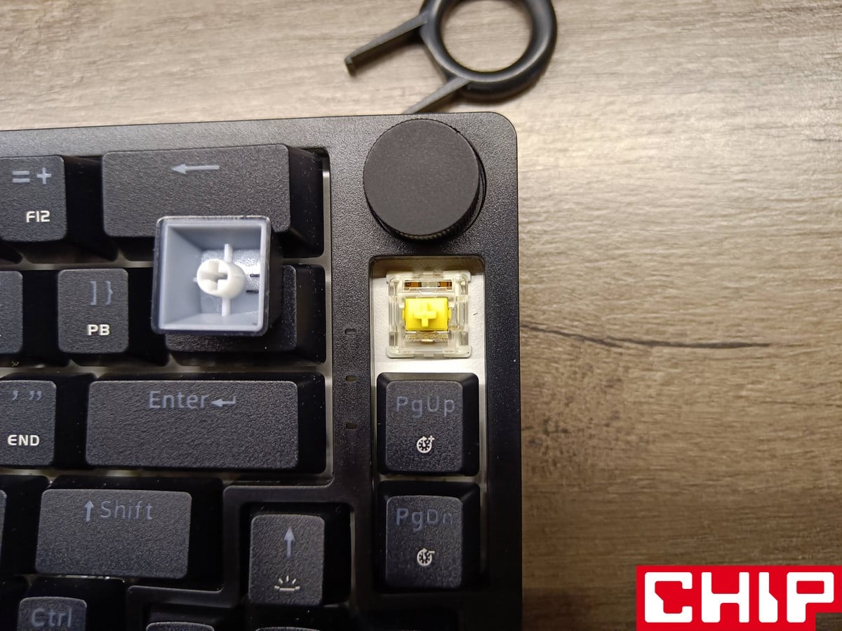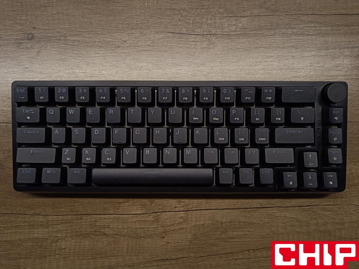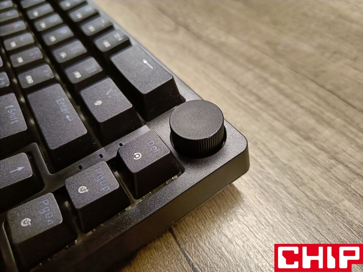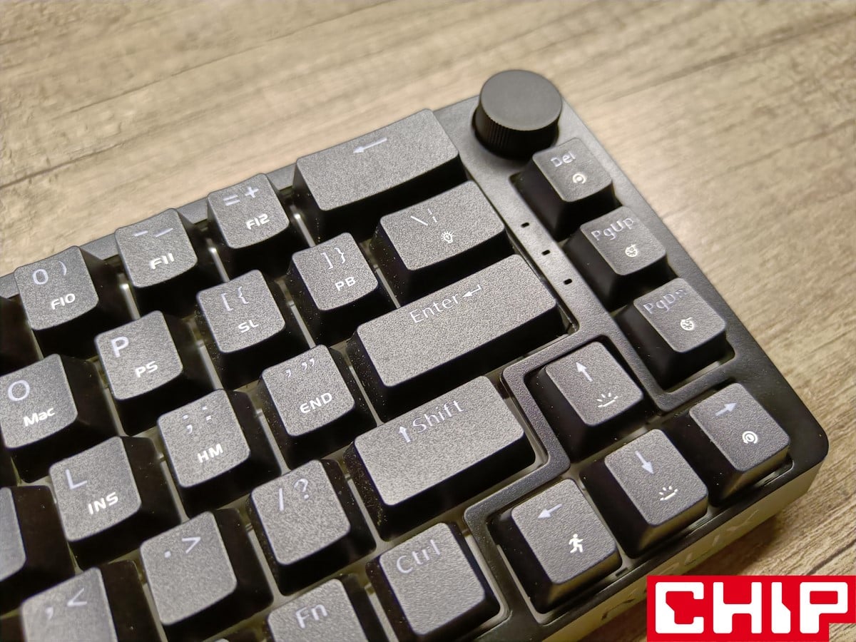 “Prostota” to za mało powiedziane. W rzeczywistości Krux sprowadził swój model ATAX 65% Pro RGB Wireless do praktycznie minimum. Tylko praktycznie, bo w gruncie rzeczy zachował to, co lubię najbardziej — funkcjonalność. Zamiast stawiać na bryłę 60-procentową i zaniżać przydatność klawiatury do stopnia, w którym przydają się głównie do grania, Krux dodał do niej jedną pozornie błahą, ale w praktyce bardzo ważną “kolumnę klawiszy”. To pozwoliło mu zachować przycisk delete, pełnowymiarowe strzałki, a nawet dodać do mieszanki przyzwoite pokrętło, dzięki któremu możemy na bieżąco zmieniać poziom głośności (precyzja do 2%) oraz wznawiać/pauzować nagrania poprzez jego wciśnięcie.