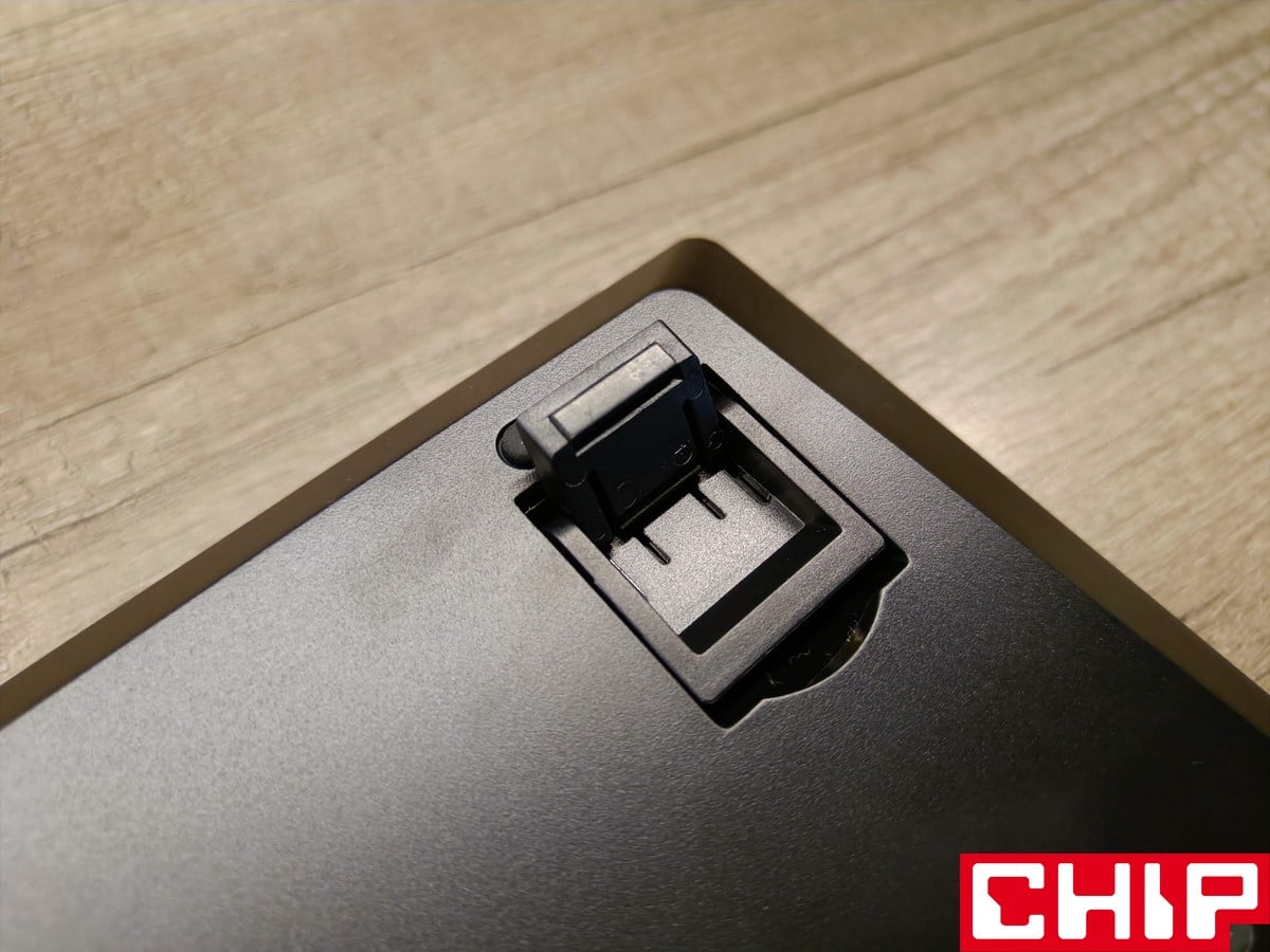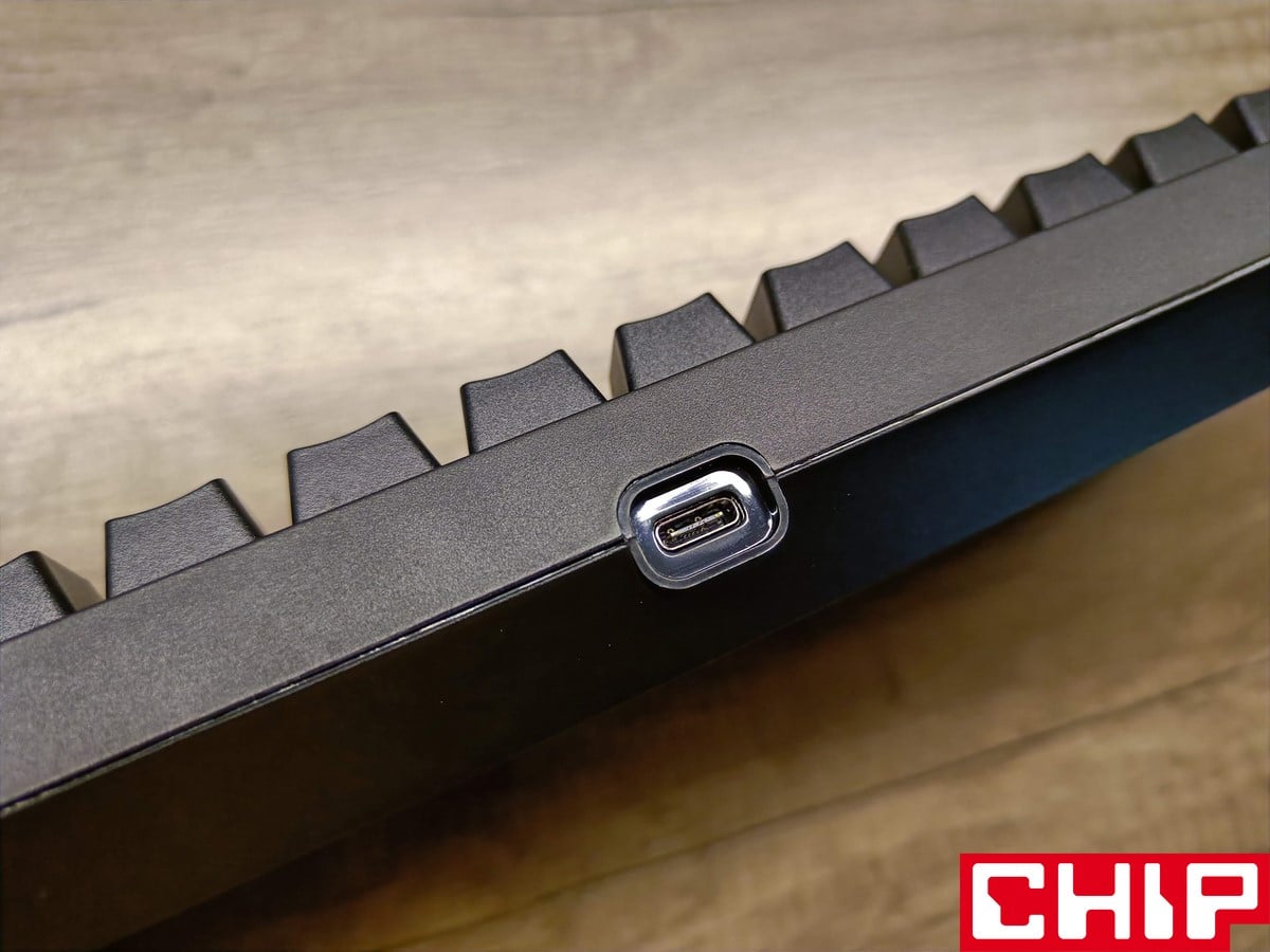 Warto też wspomnieć, że na tylnej krawędzi tego modelu znalazł się port USB-C do trybu przewodowego i ładowania, a na spodzie przełącznik on/off trybu przewodowego/bezprzewodowego, cztery grube gumowe wstawki na rogach oraz para podwójnych nóżek z (również) gumowym wyłożeniem. Czy można się do czegoś przyczepić? Jak na moje oko i jak na klawiaturę tego typu (możliwie najtańszą z bogactwem funkcji) nie, ale z drugiej strony musicie być świadomi, że dodatkowe funkcje zostały nie wygrawerowane w przyciskach, a jedynie nadrukowane. Takie coś spotyka się jednak nawet w droższych modelach, więc trudno się temu dziwić.