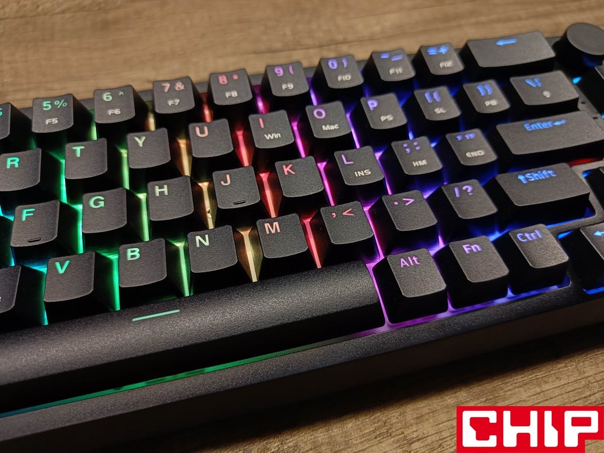 Nie spektakularne, ale przynajmniej funkcjonalne. Diody zastosowane w Krux ATAX 65% Pro RGB Wireless może i są obecne pod każdym przyciskiem, a generowane przez nie światło rozlewa się stosunkowo dobrze po czcionce, ale w ogólnym rozrachunku całemu podświetleniu brakuje “życia i charakteru”, co po prostu widać. Jest jednak w pełni funkcjonalne i może rozświetlić nasze biurko, co zdecydowanie jest najważniejsze.
