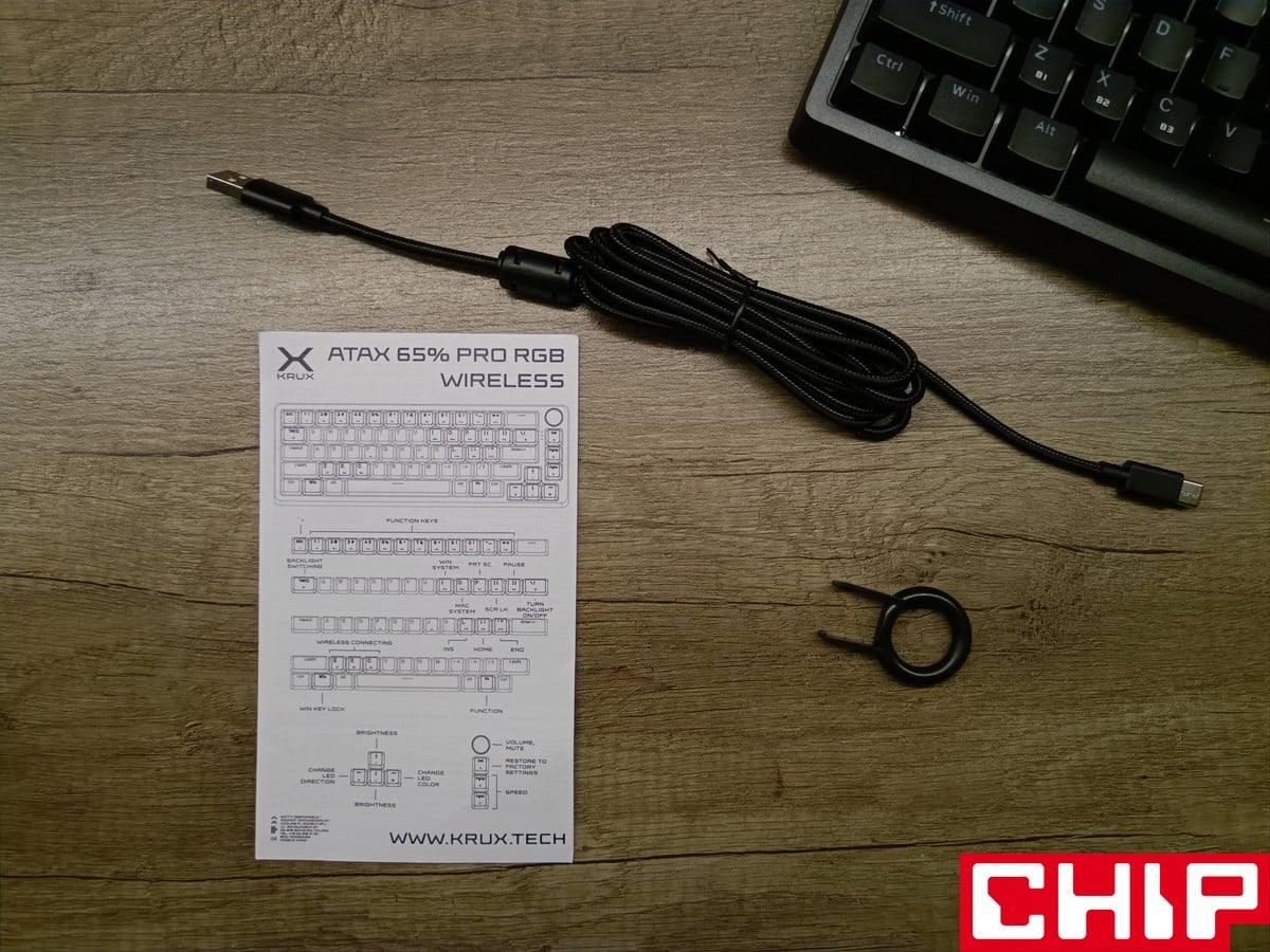 KRUX buduje swoją markę na rynku konsekwentnie i charakterystyczne pudełko jest tego świetnym przykładem. Na nim znajdziemy wizualizacje produktu i poznamy jego najważniejsze cechy, a wewnątrz niego instrukcję obsługi (eng/pl), ściągacz klawiszy oraz 1,8-metrowy przewód USB-C do USB-A.