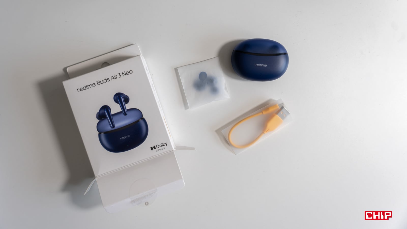Słuchawki realme Buds Air 3 Neo trafiają do nas w standardowym białym kartonowym pudełku, które z przodu przedstawia render słuchawek w skali ~80%, a poza tym wspomina o najważniejszych cechach produktu. Wewnątrz etui znajdziemy podstawowe wyposażenie, bo instrukcję obsługi w wielu językach (również “naszym”), krótki przewód USB-A do USB-C utrzymany w ciekawym kolorze oraz tradycyjny zestaw gumek w rozmiarze S, M i L, z czego te drugie są już zamontowane.