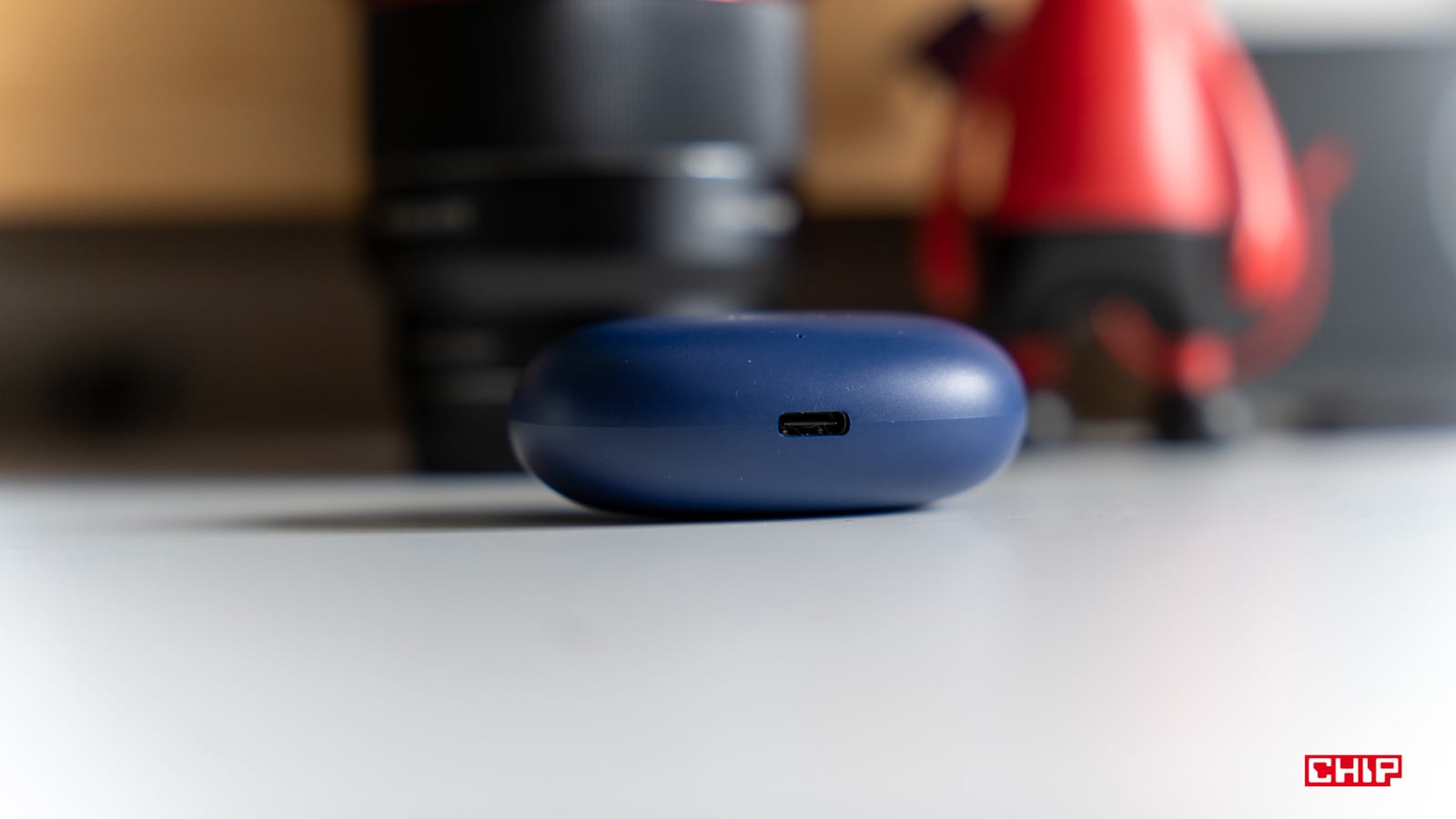 Jednak same w sobie etui jest wykonane poprawnie i jest w pełni funkcjonalne, a przede wszystkim bardzo kompaktowe. Producent zamieścił na nim swoją nazwę w kolorze białym, diodę funkcyjną oraz port USB-C do ładowania, a wewnątrz jedynie stosowne luki na słuchawki ze stykami ładującymi oraz magnesem, który utrzymuje je wewnątrz.