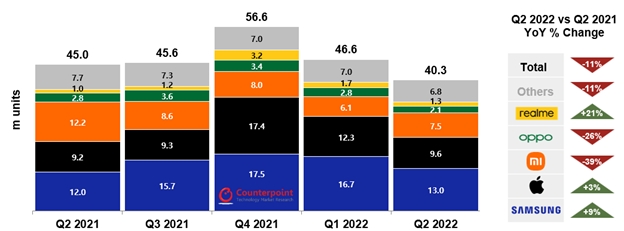 Pierwszą piątkę zamykają Oppo i Realme. Pierwszy z producentów doświadczył problemów z dostawami i produkcją w Chinach, podczas gdy drugiemu udało się odnotować dwucyfrowy wzrost w ujęciu rocznym. Analitycy Counterpoint przewidują, że ewentualne ożywienie na rynku będzie prawdopodobnie przebiegać bardzo długo i powoli.