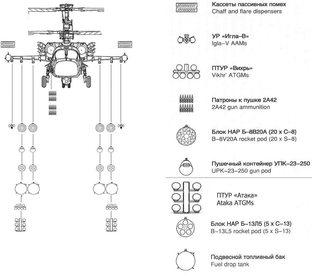 W rzeczywistości bowiem Ka-52 posiada aż sześć punktów montażowych na dodatkowe uzbrojenie (po 3 z lewej i prawej strony), mogące ważyć do 2000 kilogramów. Wśród potencjalnego uzbrojenia znajdują się bomby: