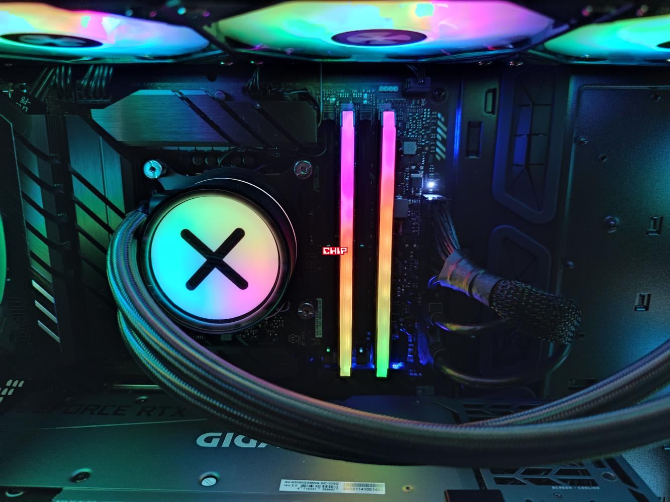 Pamięci RAM mamy 2x 16 GB 3600 MHz CL18-22-22-42-64. Zostały one specjalne zoptymalizowane przez X-Kom, aby działały z najlepszą wydajnością. Domyślnie są one ustawione na Gear 2, ale przy CR 1T. Za pamięci odpowiada Corsair i jest to model Vengeance PRO RGB SL. Są tutaj dwa wolne sloty na pamięci, więc możecie to też zawsze rozbudować.