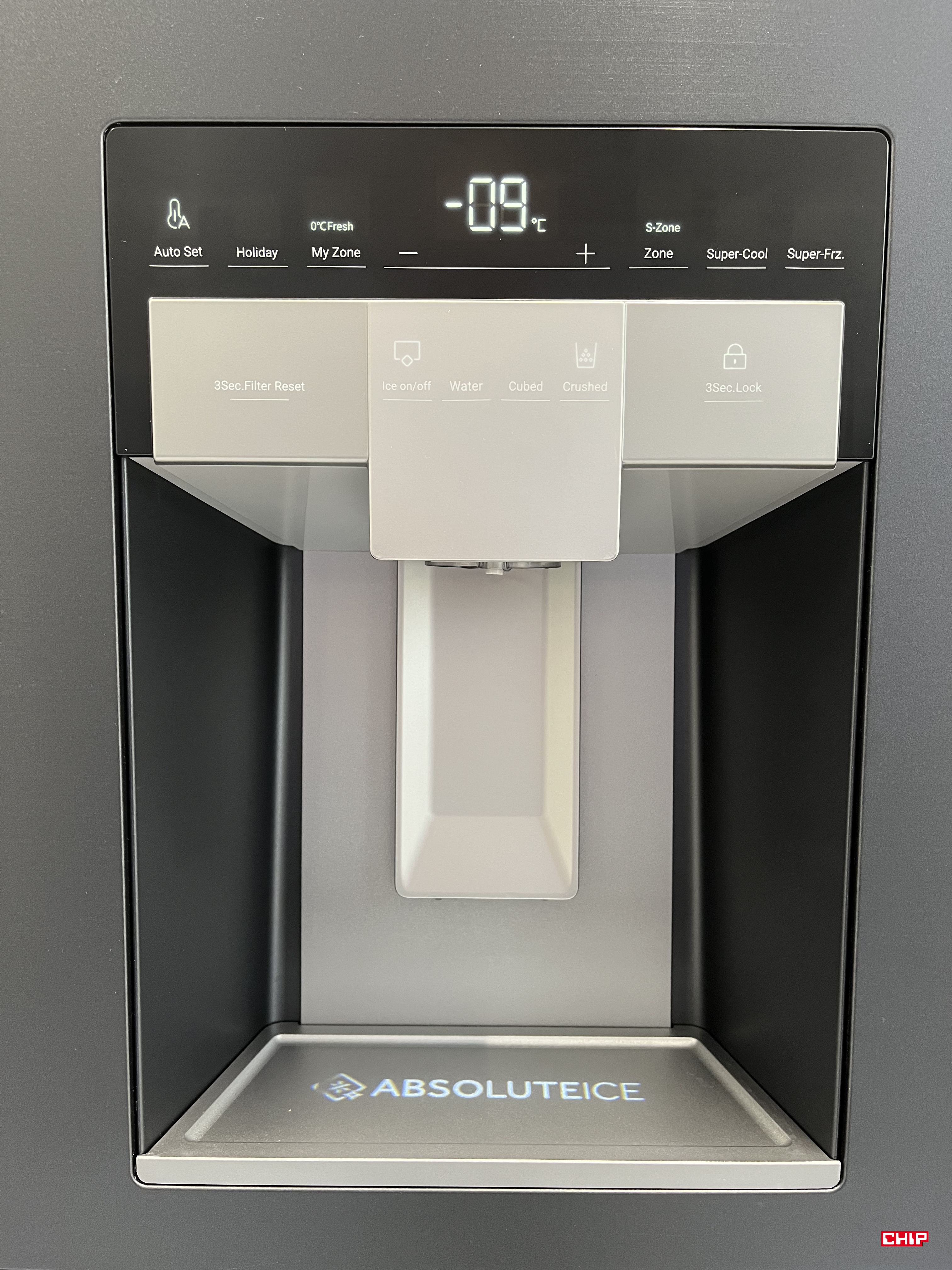 Rozświetla się też umieszczone w lewych drzwiach centrum sterowania sprzętem wraz z wbudowanym w nie modułem kostkarki Absolute Ice. Okazuje się, że ma ona własny system chłodzenia, całkowicie niezależny od chłodziarki i zamrażarki. W ten sposób zimne powietrze wewnątrz jest wolne od zapachów z innych stref lodówki.