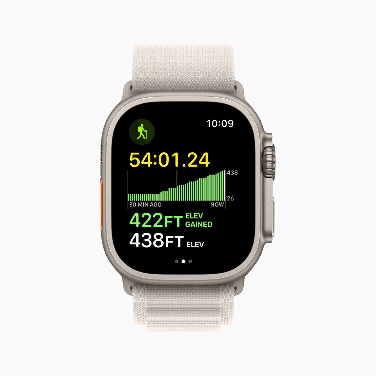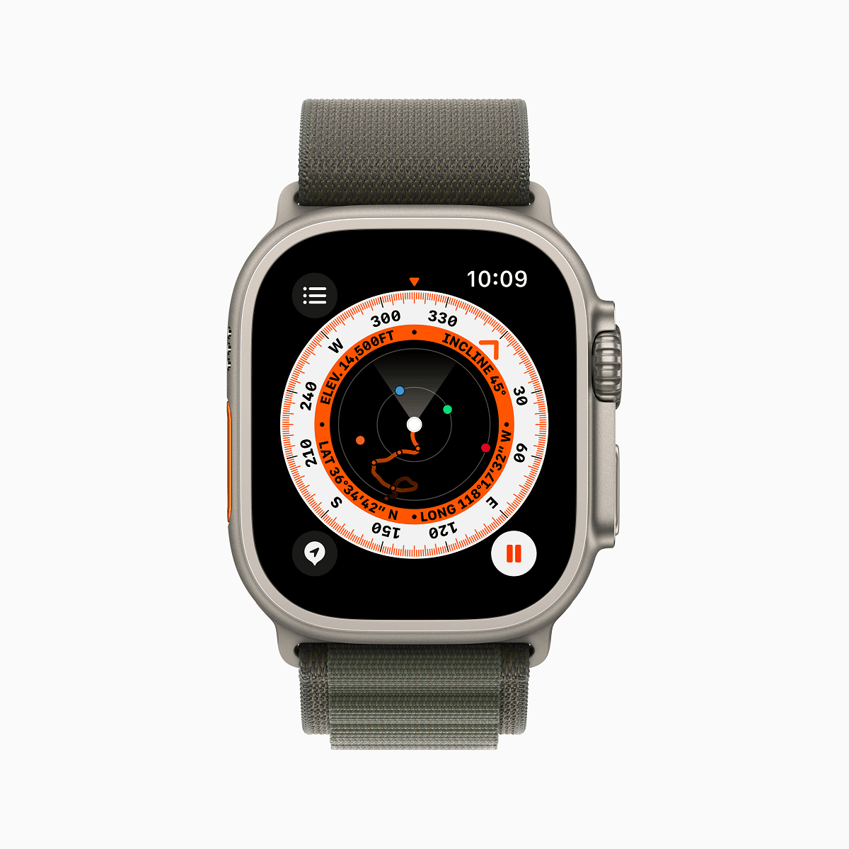 Ten model zaprojektowano z myślą o sportach wytrzymałościowych i intensywnej eksploatacji, która wymaga od urządzenia niezwykłej trwałości. Apple Watch Ultra ma tytanową kopertę 49 mm i płaskie szafirowe szkło przednie, za nim umieszczono najjaśniejszy i największy wyświetlacz wśród dotychczasowych zegarków producenta (nawet 200 nitów). Wydłużono też czas pracy aż do 36 godzin, które wydłużyć można do 60 godzin z Trybem niskiego zużycia energii. Dodano też nowy przycisk czynności w kontrastującym kolorze pomarańczowym, który można łatwo zaprogramować tak, by zapewniał szybki dostęp do różnych funkcji, takich jak Treningi czy Punkty trasy i Ślad w apce Kompas.