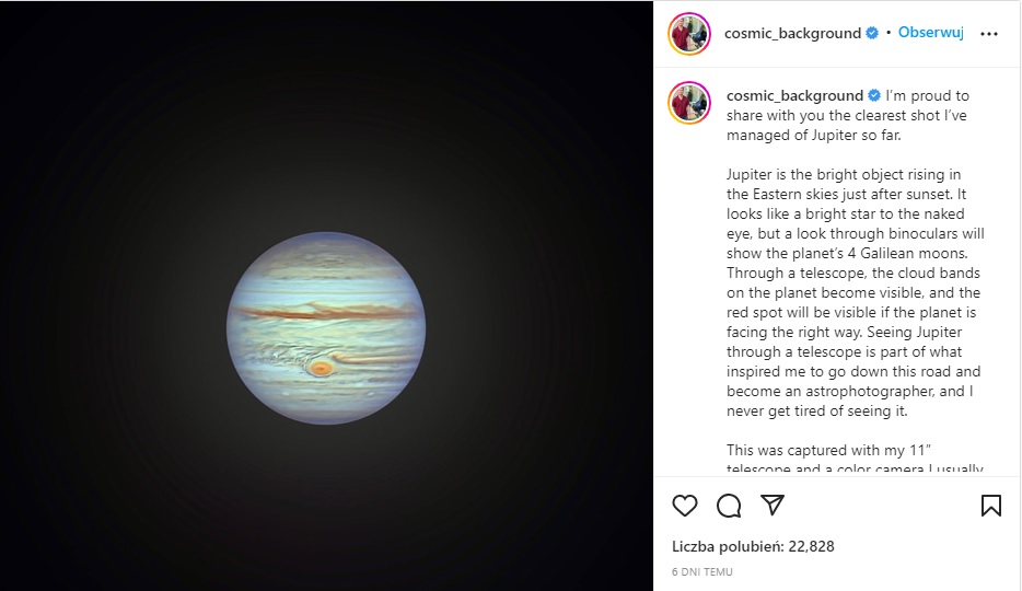 Po spędzeniu całej nocy na zrobieniu około 600 000 zdjęć, jestem zachwycony mogąc pokazać wam moje najostrzejsze jak dotąd ujęcie Jowisza. Zostało wykonane z użyciem 11″ teleskopu i aparatu, którego zwykle używam do pracy na głębokim niebie.wyjaśnił autor