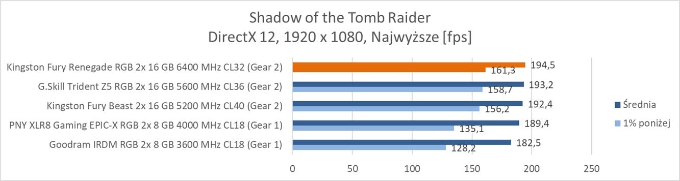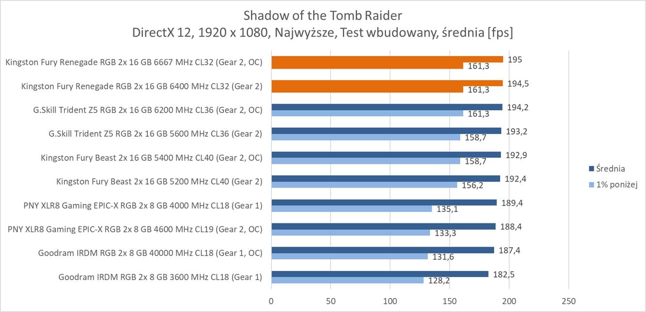 Pamięci Kingston Fury Renegade RGB 2x 16 GB 6400 MHz CL32 kupicie za ok. 1770 zł. Cena jest całkiem w stosunku do tego co otrzymujemy jest więc bardzo dobra jak na kości DDR5. Kingston zbudował szybki RAM o niskich opóźnieniach, które bardzo dobrze wypadają w testach – są one najwydajniejsze spośród testowanych pamięci. Możecie na wykresach zobaczyć ile zyskacie względem wolniejszych kości, również w grach. Nie zabrakło tutaj również dobrego wykonania czy obecności podświetlenia, przez co całość naprawdę dobrze wygląda. Plusem tutaj jest technologia Infrared Sync, która synchronizuje RGB kości.