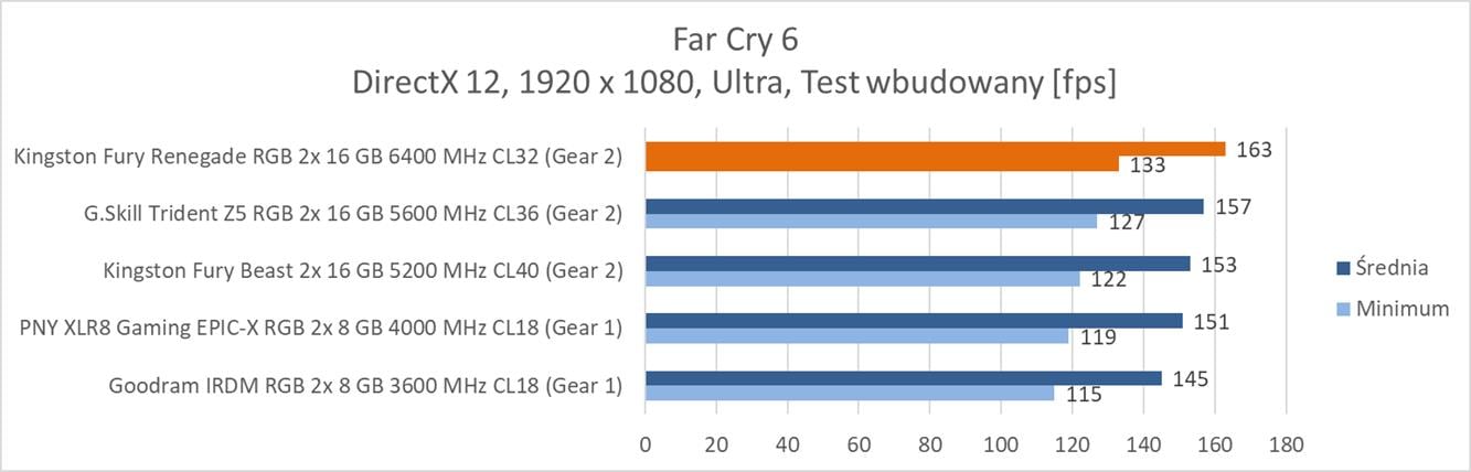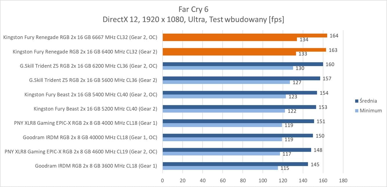 Wyniki są bardzo dobre i pamięci są zdecydowanie najwydajniejsze spośród do tej pory testowanych. Mają one przewagę nad 5600 MHz CL36. Różnice może nie są wybitnie wielkie, ale na pewno występują. W grach również są one widoczne, w szczególności w Far Cry 6, gdzie przyrost średnich fps wynosi 6.