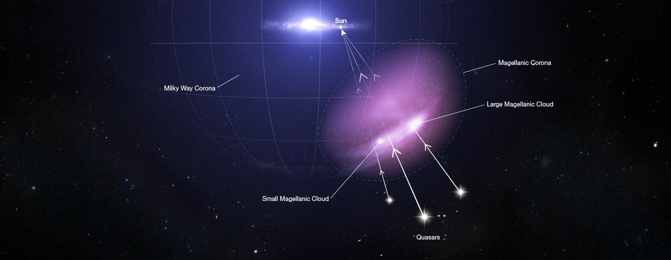 Dane pochodzące z Hubble’a i FUSE zostały przeszukane pod kątem ultrafioletowych obserwacji kwazarów znajdujących się miliardy lat świetlnych za koroną otaczającą Wielki Obłok Magellana. Kwazary to niezwykle jasne rdzenie galaktyk zawierających aktywne czarne dziury. Dzięki tej jasności udało się zidentyfikować poświatę rzucaną przez koronę Magellana. Można to porównać do sytuacji, w której po ciemku nie zobaczymy mgły, lecz jej poświata stanie się widoczna po podświetleniu jej za pomocą latarki. Wcześniej na podobnej zasadzie wykryto koronę otaczającą galaktykę Andromedy.