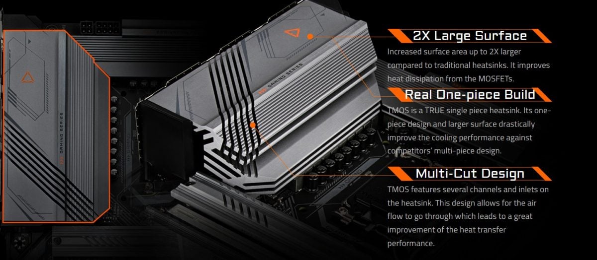 Te zestawy to z kolei trio, bo stanowią je dławiki, kondensatory oraz MOSFETy. Te ostatnie są najczęściej ukryte w chipie wraz ze sterownikiem pod aluminiowym radiatorem. Dziś bowiem integracja MOSFETów i kontrolerów w jednym układzie jest powszechna i choć ma to swoje plusy (oszczędność miejsca na płycie i zasobów, to największym minusem jest trudność z ich chłodzeniem, jako że łatwiej odebrać ciepło z kilku układów, a nie pojedynczego. O ile do tej pory nie było to raczej problemem, tak w przyszłości może zacząć… o ile wspomniane radiatory nie doczekają się za moment wentylatorów.