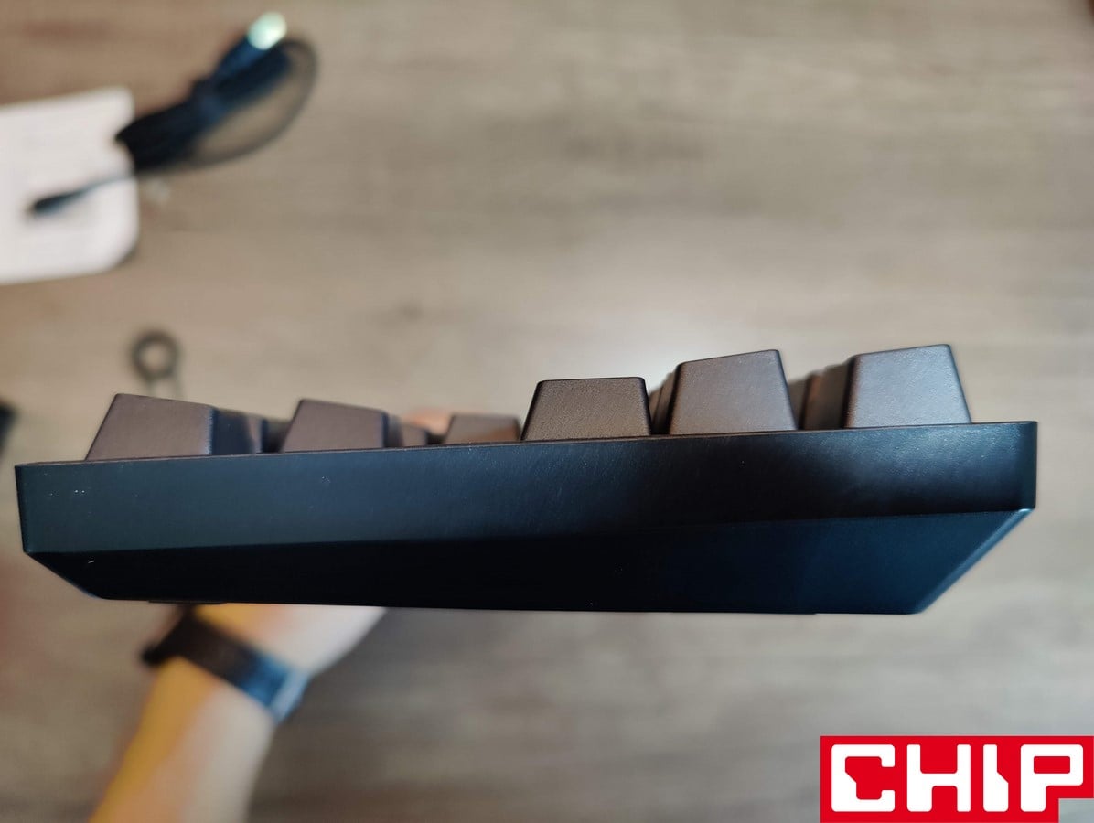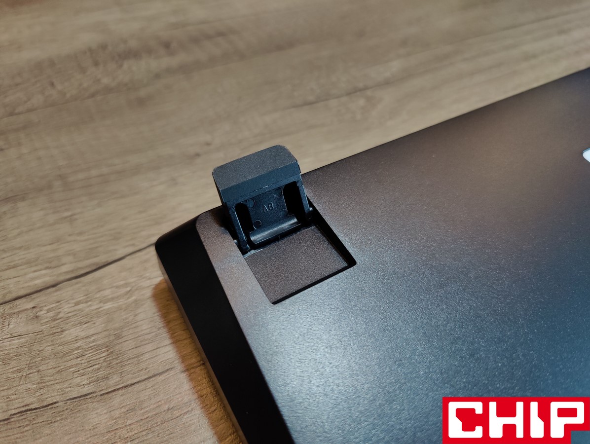 Idąc dalej, wyposażenie jest dosyć standardowe i obejmuje parę nóżek, w których ciekawie rozwiązano kwestię paneli antypoślizgowych. Zastosowano je bowiem na całej długości, co sprawia, że pełnią swoją rolę zarówno po złożeniu, jak i po rozłożeniu, wspomagając drugą parę na spodzie. Poza tym warto też wspomnieć o zastosowanym porcie USB-C, który z pozoru jest odpowiedni, ale producent poszedł tutaj w niebezpiecznym kierunku. Z jednej bowiem strony specjalnie wyżłobione zastawki głęboko osadzonego portu zapewniają wyższą stabilność USB, a z drugiej wpięcie do klawiatury innego przewodu jest niemożliwe.