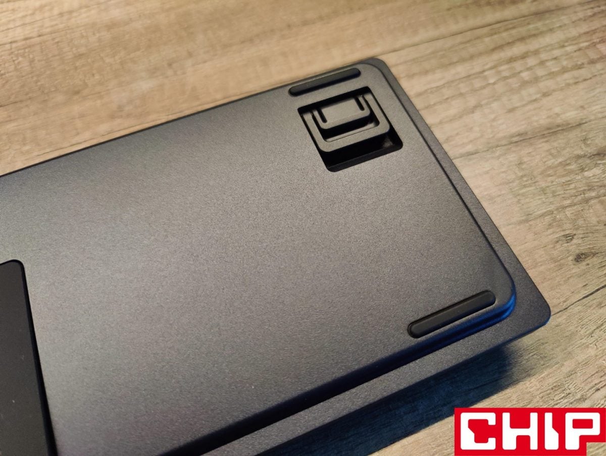 Inne interesujące elementy obejmują port USB-C po lewej stronie tylnej krawędzi oraz podwójne nóżki regulujące kąt nachylenia na tyle, którym towarzyszą solidne gumowe podkładki antypoślizgowe. W centrum spodniej części znalazła się też ukryta pod gumową wstawką “półeczka”, w której Steelseries ukrył ściągacz do klawiszy (keycapów) Jej sens jest jednak dla mnie zupełnie nie do pojęcia i mam wrażenie, że wraz z informacją w instrukcji co do możliwości zakupu innych keycapów, a nawet przełączników, ma nam tylko przypomnieć o sklepie producenta.