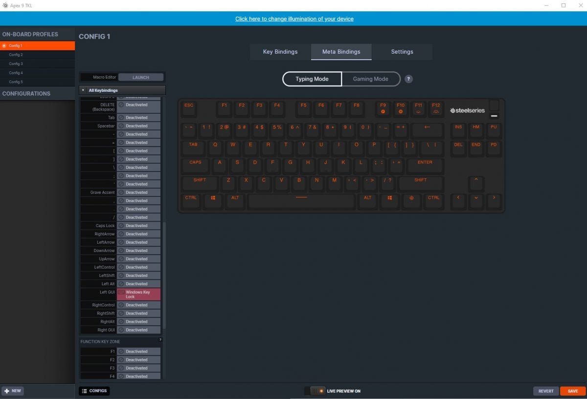 Tyczy się to również wielu dostępnych trybów podświetlenia, które Steelseries jednak ulepszył, rozdzielając je na trzy jednocześnie działające tryby. Mowa o tym tradycyjnym, aktywującym się po naciśnięciu klawisza oraz włączanym po ustawionym wedle własnego upodobania czasie, którego polecam ustawić tak, aby diody po prostu się dezaktywowały.