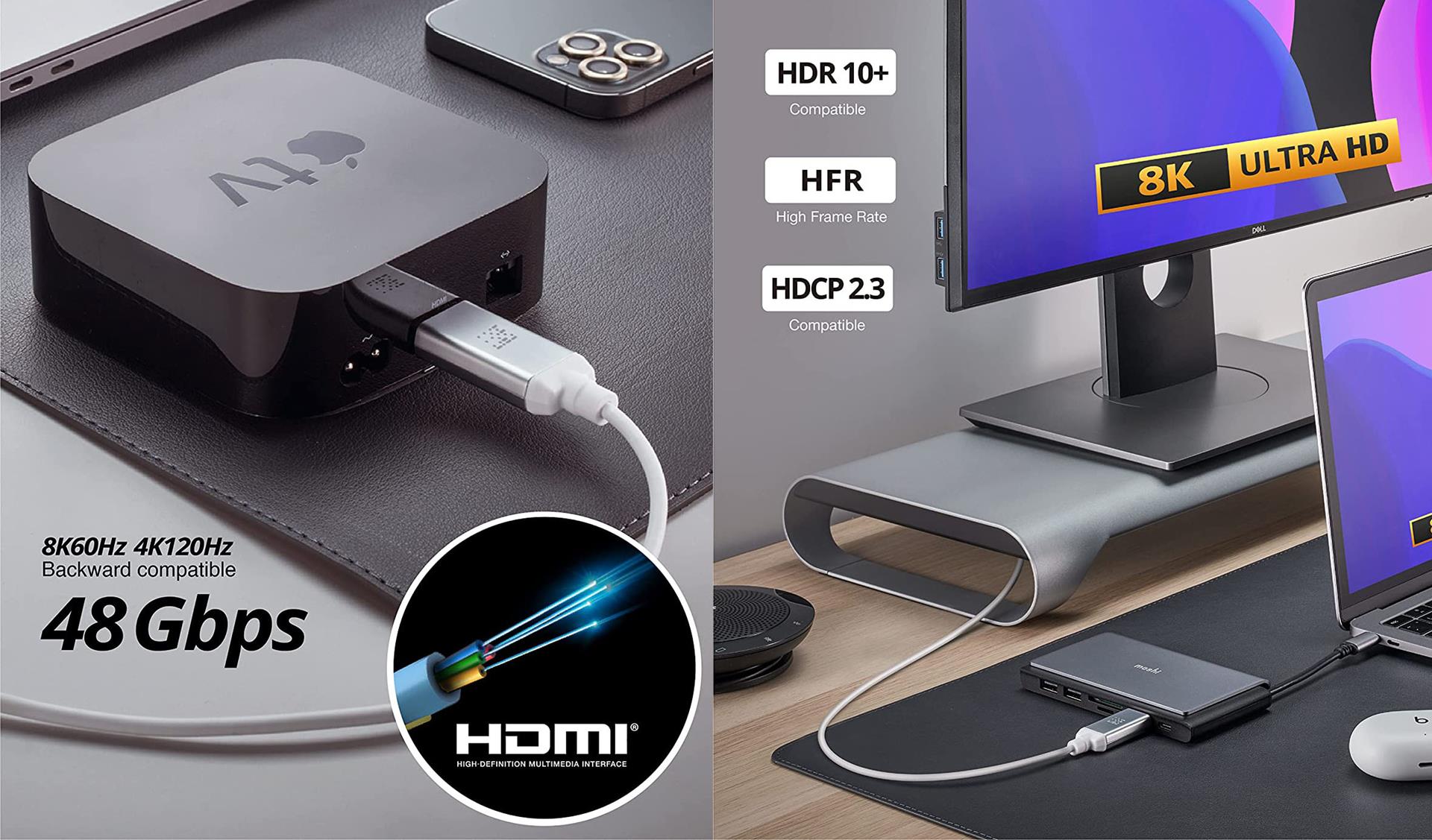 Te przewody HDMI 2.1 w praktyce zapewniają przepustowość na poziomie 48 Gb/s, co oznacza, że wspierają odtwarzanie nagrań w rozdzielczości 8K i o częstotliwości odświeżania 60 Hz lub 4K i 120 Hz. Wszystko to przy wsparciu tradycyjnych technologii (HDCP 2.3 i Dynamic HDR), próbkowania 4:2:0, 4:2:2 i 4:4:4 oraz audio DTS:X, Dolby 7.1, eARC oraz DTS-HD MA.