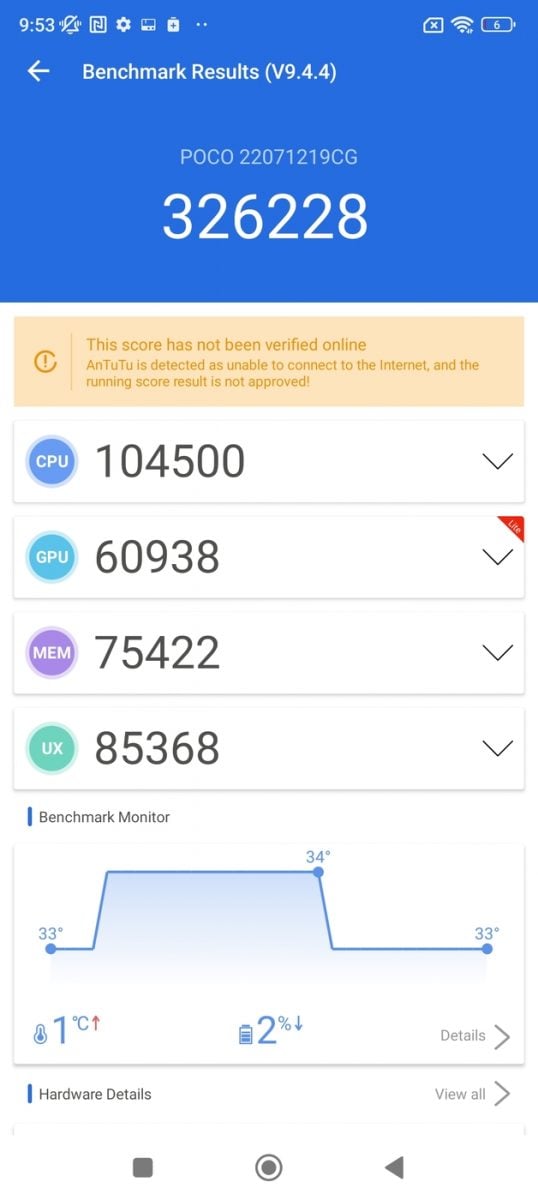 - Antutu Benchmark 9.4.4 – 326 228 pkt