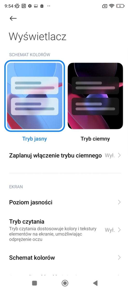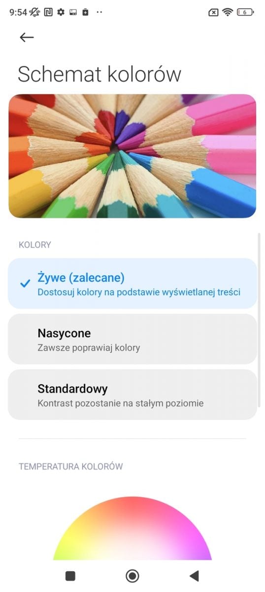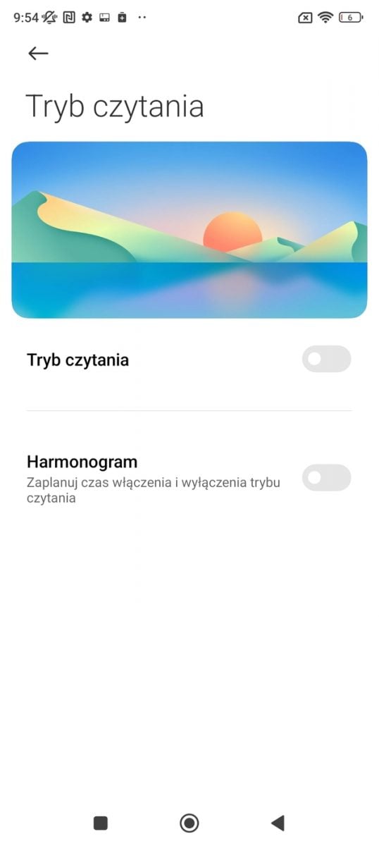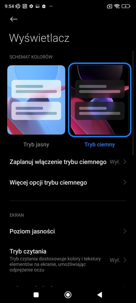 W ustawieniach znajdziemy tryb ciemny dla menu, tryb czytania, możliwość ustawienia częstotliwości odświeżania oraz nasycenia i temperatury barwowej.