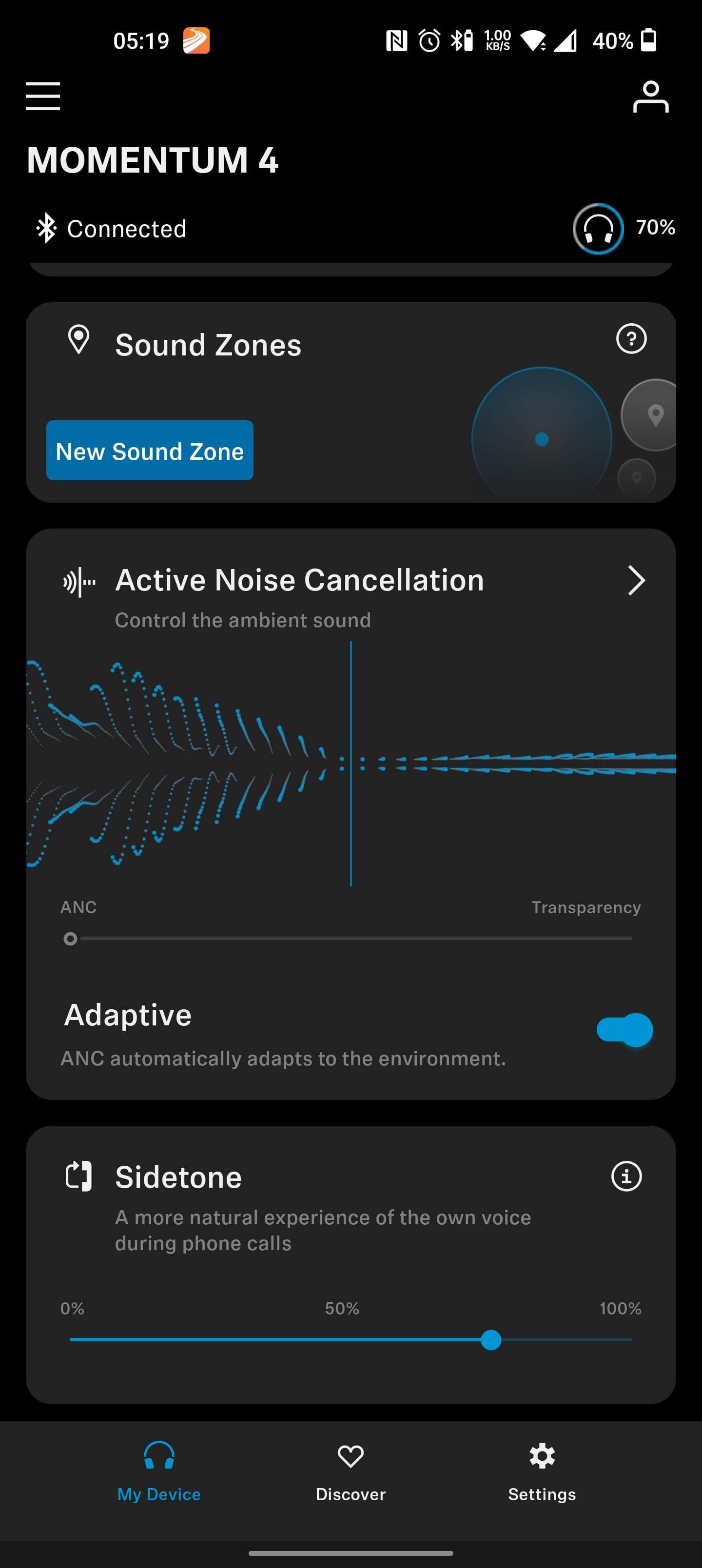 Momentum 4 Wireless to gwarancja słuchania muzyki nie przez 20, nie przez 40, a przez całe 60 godzin na jednym ładowaniu 700-mAh akumulatora i to nawet z aktywowanym ANC. Osobiście jestem pewny, że taki czas jest możliwy, jako że spędziłem cały swój roboczy tydzień z Momentum 4 Wireless na głowie, spędzając w pracy łącznie ~13 godzin dziennie, co tyczyło się zarówno rozmów, jak i słuchania muzyki z aktywowanym ANC.