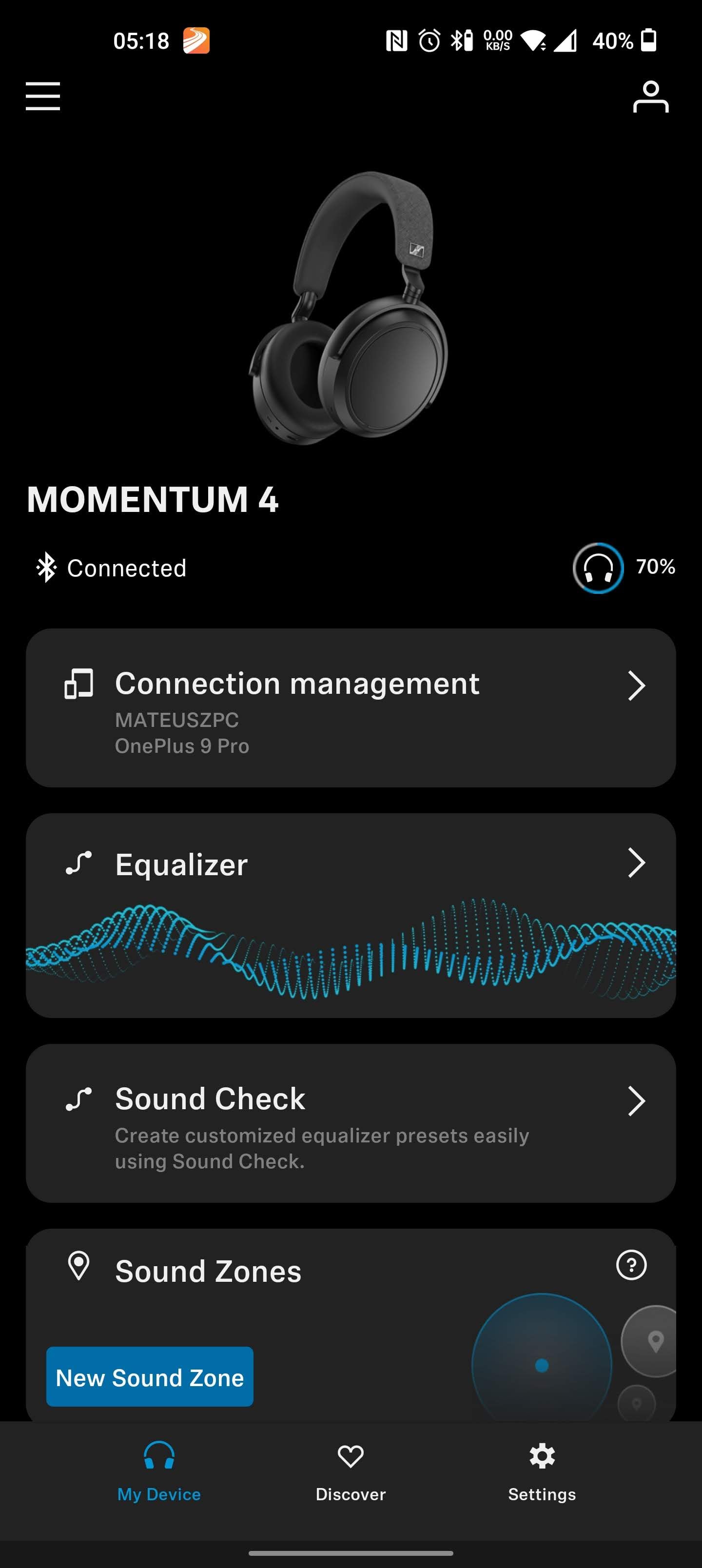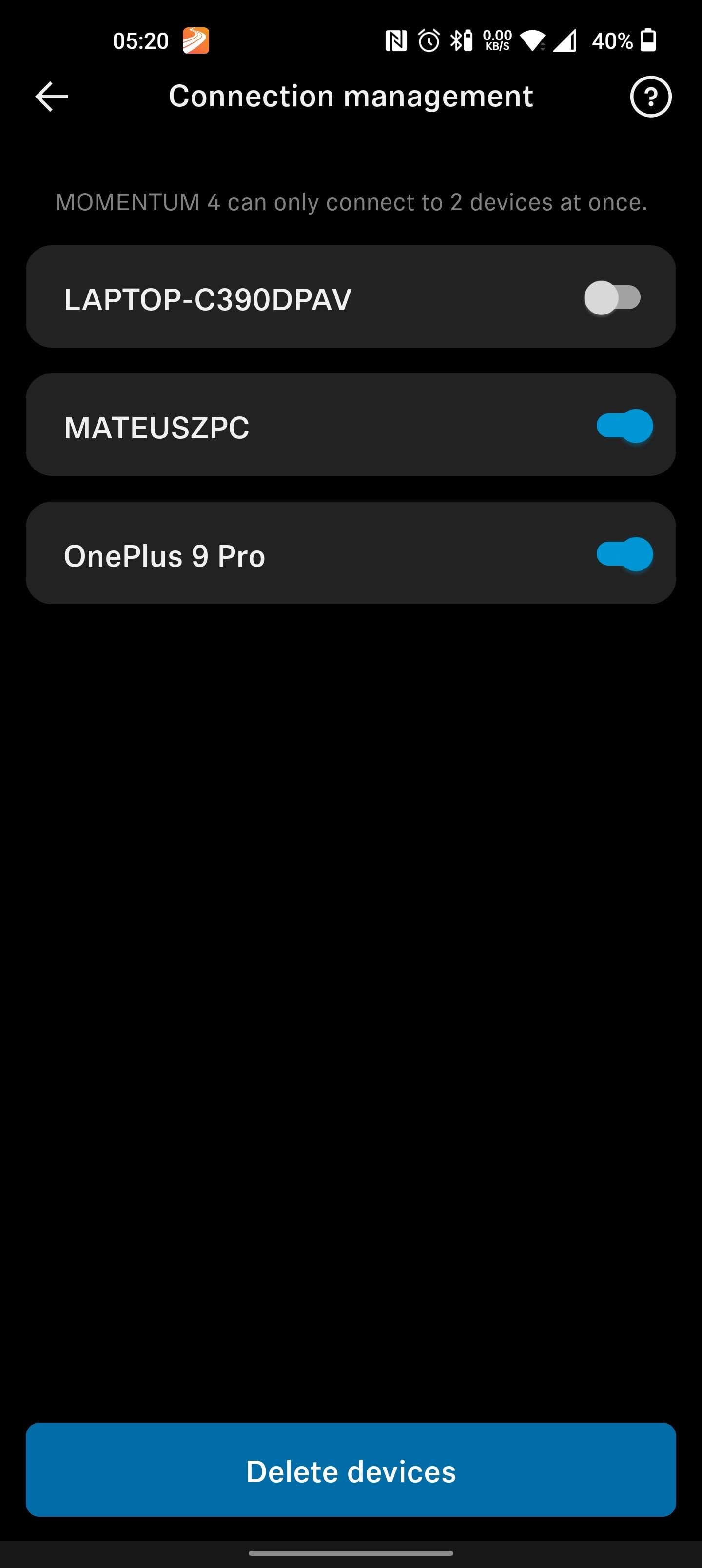 Warto też podkreślić, że Momentum 4 Wireless wspiera jednoczesne połączenie z dwoma urządzeniami po Bluetooth 5.2 i to również w konfiguracji Bluetooth/USB lub jack. W praktyce więc możecie np. podłączyć ten zestaw do komputera po przewodzie i zestawić połączenie bezprzewodowe z telefonem, aby akumulator w takich momentach nigdy się Wam nie wyczerpał. Warto podkreślić, że ten nie jest potrzebny słuchawkom do działania w trybie przewodowym, choć oczywiście wpięcie USB-C do niego zapewni zarówno sygnał dźwięku, jak i aktywuje proces ładowania.