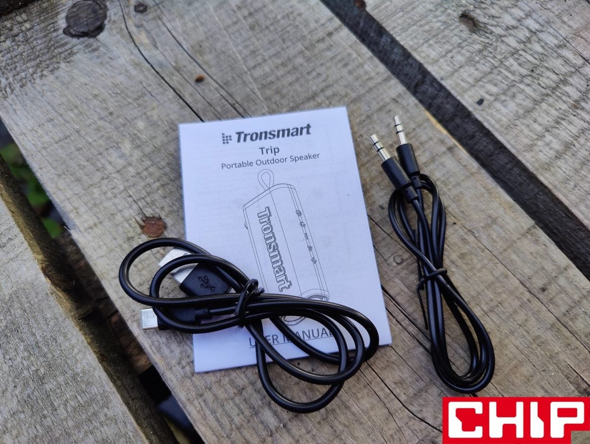 Jak możecie zobaczyć poniżej, głośnik Tronsmart Trip dociera do nas w niewielkim opakowaniu, wewnątrz którego znajdziemy instrukcję obsługi oraz dwa krótkie przewody w gumowych osłonkach. Mowa o zarówno przewodzie do ładowania (USB-C do USB-A) oraz sygnałowym przewodzie jack 3,5 mm (AUX) do trybu przewodowego.