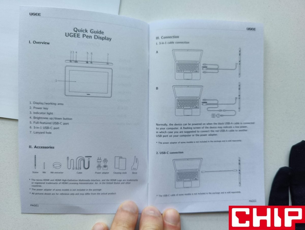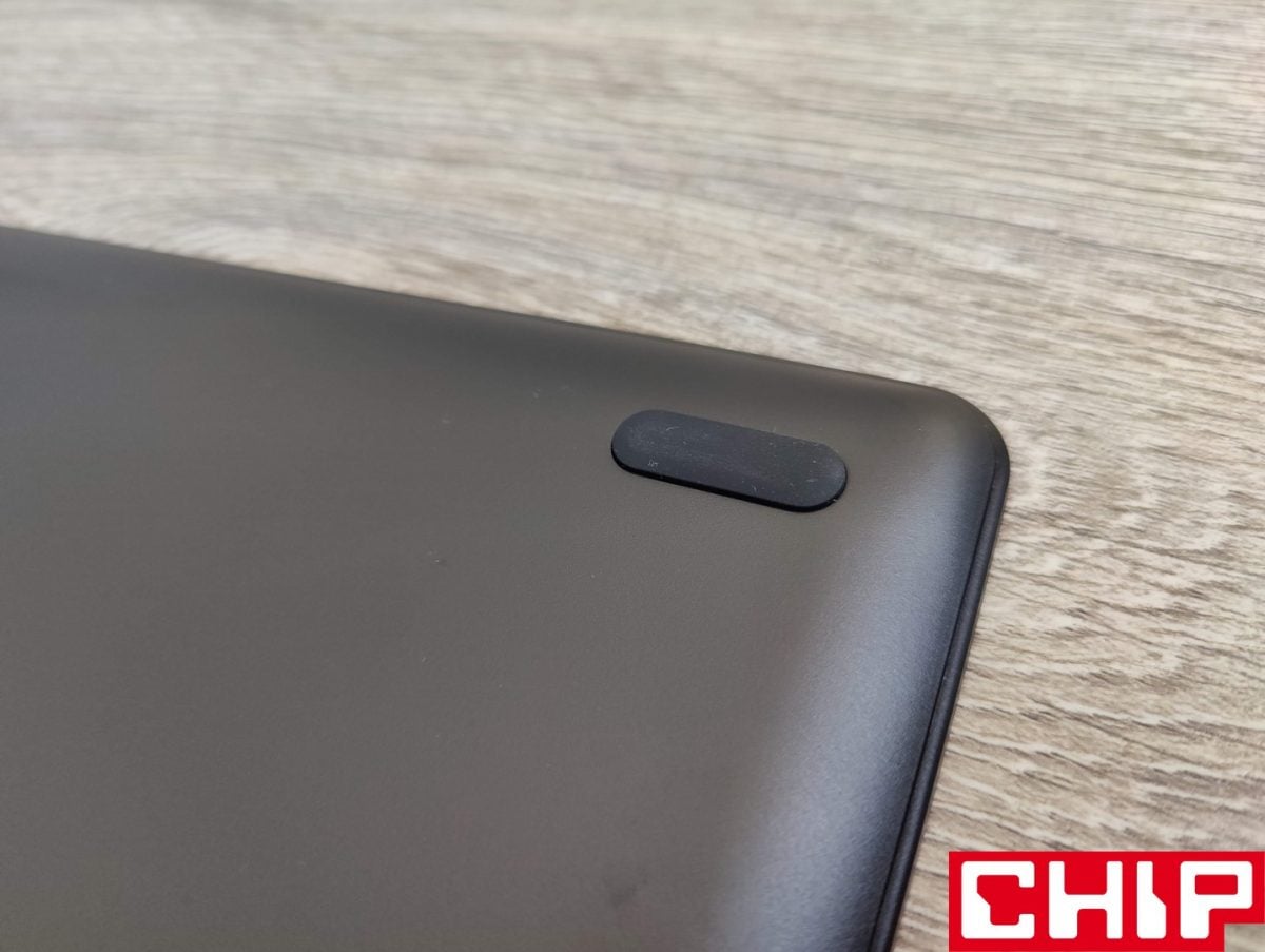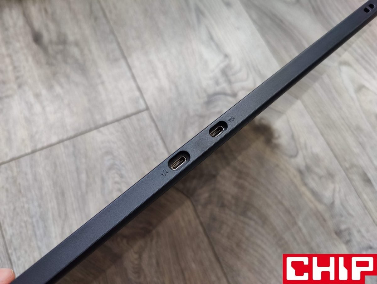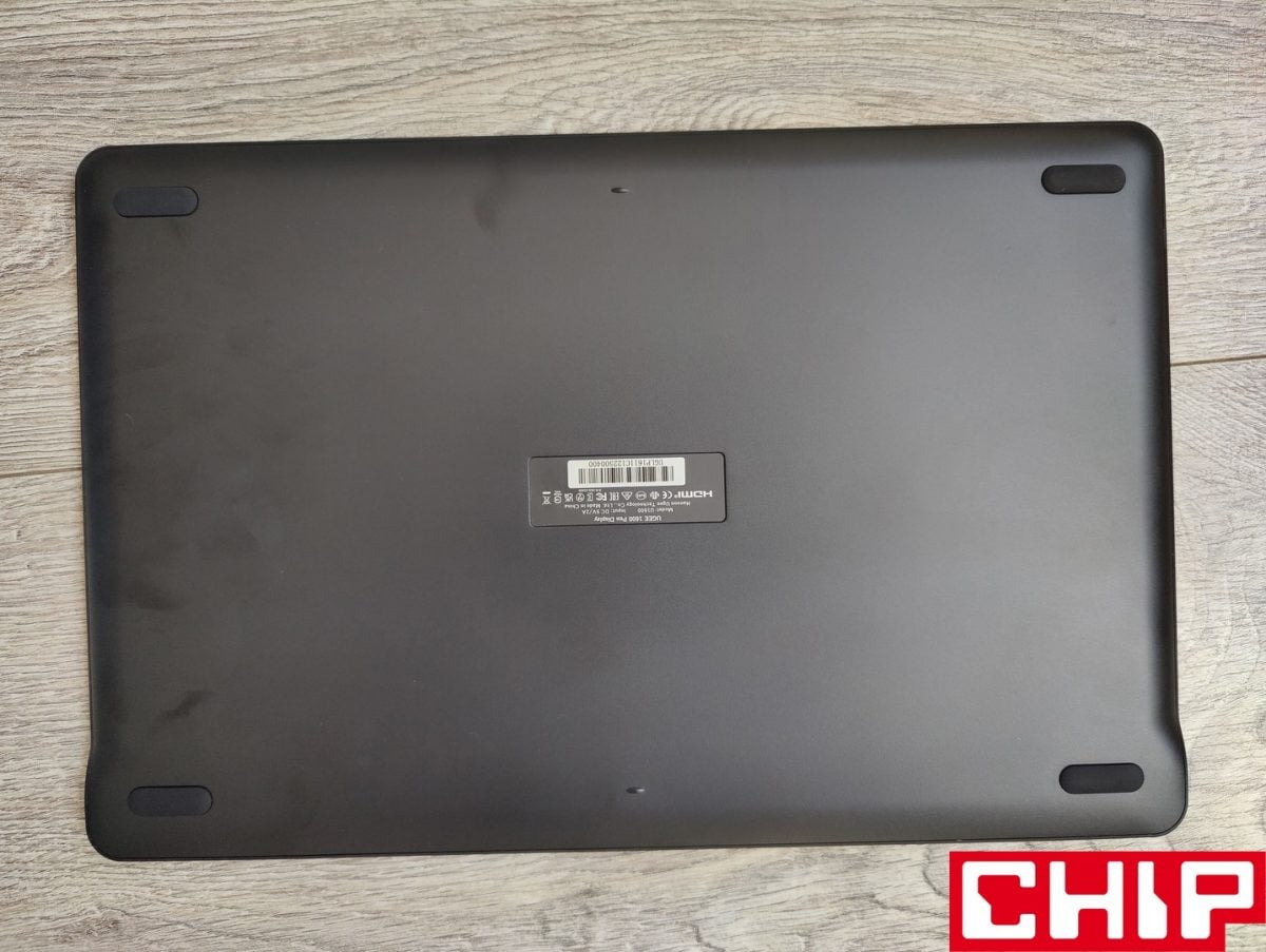 Z reguły tablety graficzne są proste w budowie i UGE U1600 nie jest w tym wyjątkiem ze swoją plastikową obudową. Ta ugościła dwa przyciski na górnej krawędzi (on/off oraz dwupoziomowy do regulacji poziomu jasności), cztery antypoślizgowe gumowe podkładki na tyle, dwa dziwne plastikowe występy, które z racji przewyższania samych podkładek, rysują blat. Producent zdecydował się też na lukę z myślą o lince smyczy (niestety samo pióro go nie posiada) oraz dwa osobne porty USB-C na zdecydowanie najbardziej korzystnej, bo górnej krawędzi. Jeden wykorzystujemy do połączenia z innym sprzętem za pośrednictwem dołączonego przewodu, a drugi do trybu połączenia USB-C do USB-C (do kupienia osobno) w przypadku kompatybilnych urządzeń.