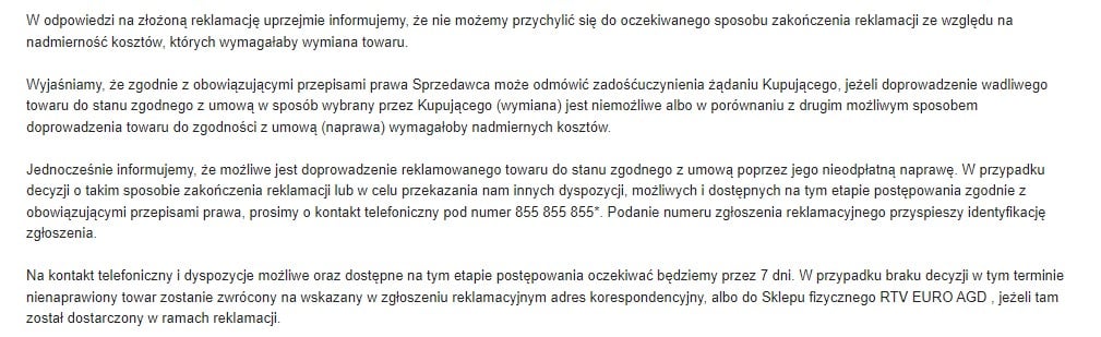 Oczywiście nie – decyzji doczekałem się w ostatni dzień, co było tylko dolaniem oliwy do ognia mojej nadszarpniętej i tak cierpliwości. Zwłaszcza że wtedy też dowiedziałem się o opcjach rozwiązania sprawy – albo odstąpienie od umowy i zwrot tylko części środków, albo naprawa, która w tym wypadku wydaje się jedynie mniejszym złem. Dlaczego bowiem miałbym tracić na tym, że dostałem fabrycznie wadliwy sprzęt i nawet nie miałem okazji z niego skorzystać?