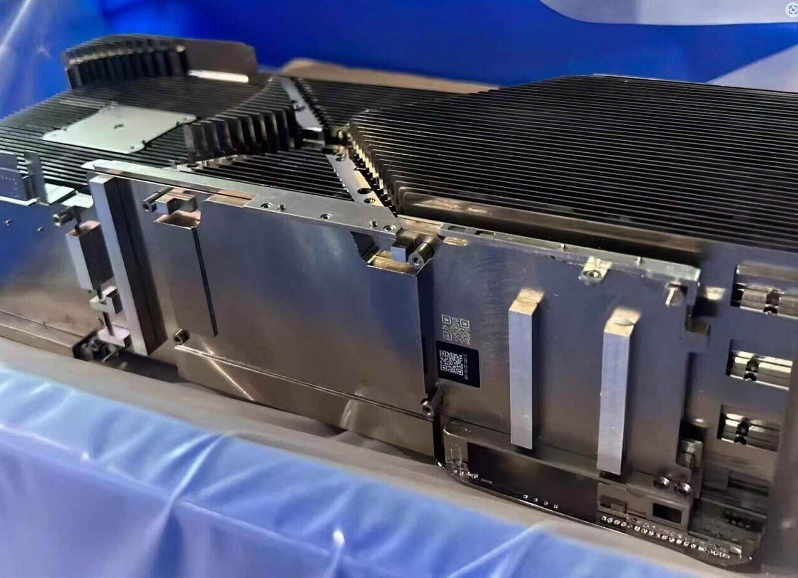Wygląda na to, że chłodzenie dla 900-watowego (ponoć wycofanego już z planu) potworka miało mieć zupełnie inny radiator. Finy zamiast być ustawione “pod kątem”, leżą równolegle do laminatu karty. Ponadto tak zwana “zimna płyta” została umieszczona nie na spodzie, a na boku, co sugeruje poniekąd montaż laminatu nawet na bokach, ale jest to mało prawdopodobne… najpewniej, bo wspornik montażowy również znalazł się na boku.