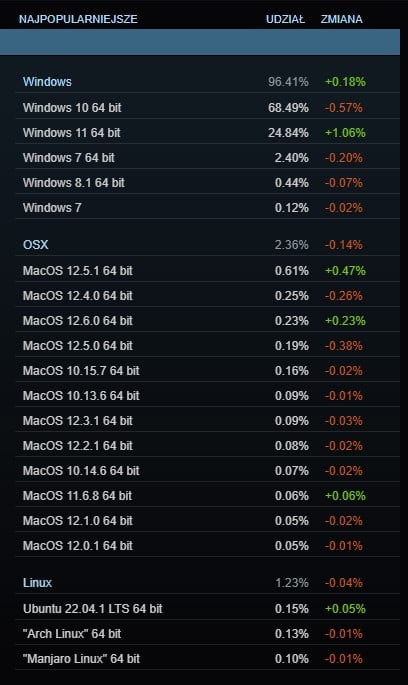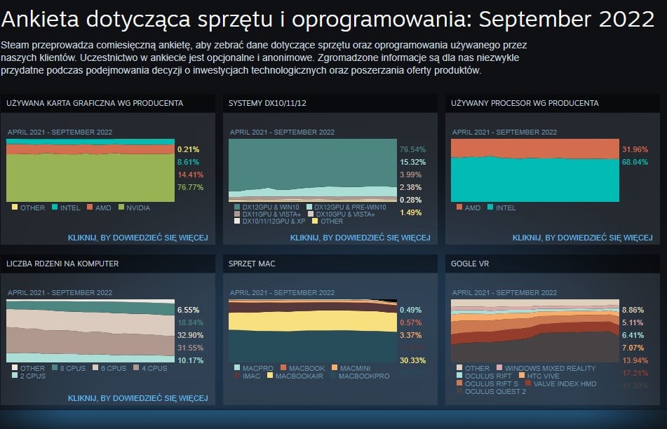 Najnowszy raport Steam Hardware & Software Survey ponownie zapewnił nam spojrzenie na część rynku PC, w której królują gracze. Nie jest to wprawdzie zestaw danych przedstawiających rzeczywisty stan rynku, bo dotyczy on wyłącznie tych użytkowników Steama, którzy zostali wylosowani i zgodzili się na wzięcie udziału a audycie. Jednak nawet pomimo tego te raporty stanowią od lat kopalnię wiedzy o stanie sprzętu wśród graczy, jako że Steam to platforma cyfrowej dystrybucji gier.