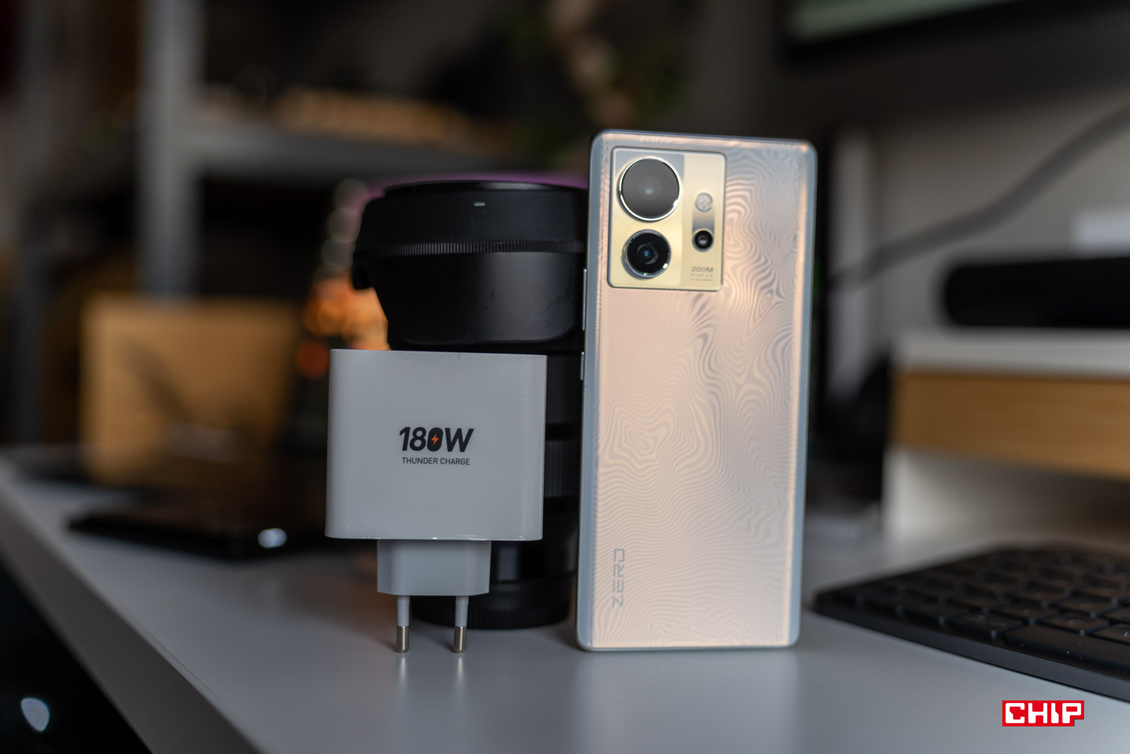 Infinix Zero Ultra ma akumulator o pojemności 4500 mAh. To w pełni wystarcza na przynajmniej jeden pełny dzień intensywnego użytkowania. Ale główną gwiazdą jest tutaj rekordowo wysoka moc ładowania aż 180 W. Możliwa do uzyskania dzięki technologii Thunder Charge 180 W. Producent zapewnia, że czas ładowania do pełna to 12 minut i się nie myli. Co prawda udało mi się uzyskać wynik powyżej 12 minut (ale mniej niż 13) i ten czas będzie nieco wyższy jeśli np. w trakcie ładowania coś robimy na smartfonie, albo ładujemy go w zimnym otoczeniu. Niemniej jest to faktycznie wynik do osiągnięcia, o ile w Ustawieniach włączymy tryb szybkiego ładowania. Ale i bez niego jest dobrze, bo w standardowym trybie ładowania do pełna trwa 17 minut.