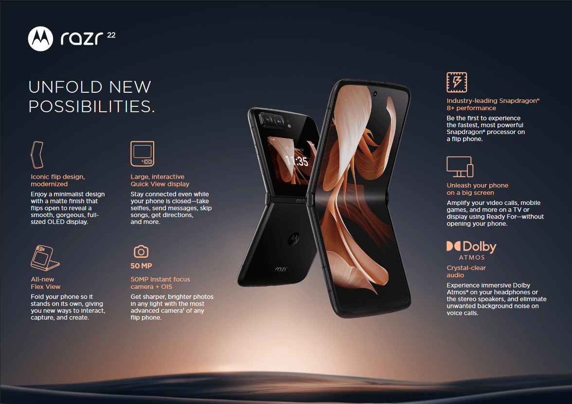 Względem poprzednika motorola razr 2022 wprowadza całkiem sporo nowości. Wystarczy wspomnieć o układzie Snapdragon 8+ Gen 1, obecnie najmocniejszej jednostce ze stajni Qualcomm. Powiększeniu w stosunku do poprzedniego modelu uległa pojemność baterii – obecnie liczy 3500 mAh i można ją ładować szybciej dzięki technologii TurboPower 30W.