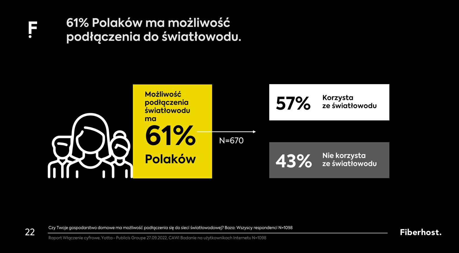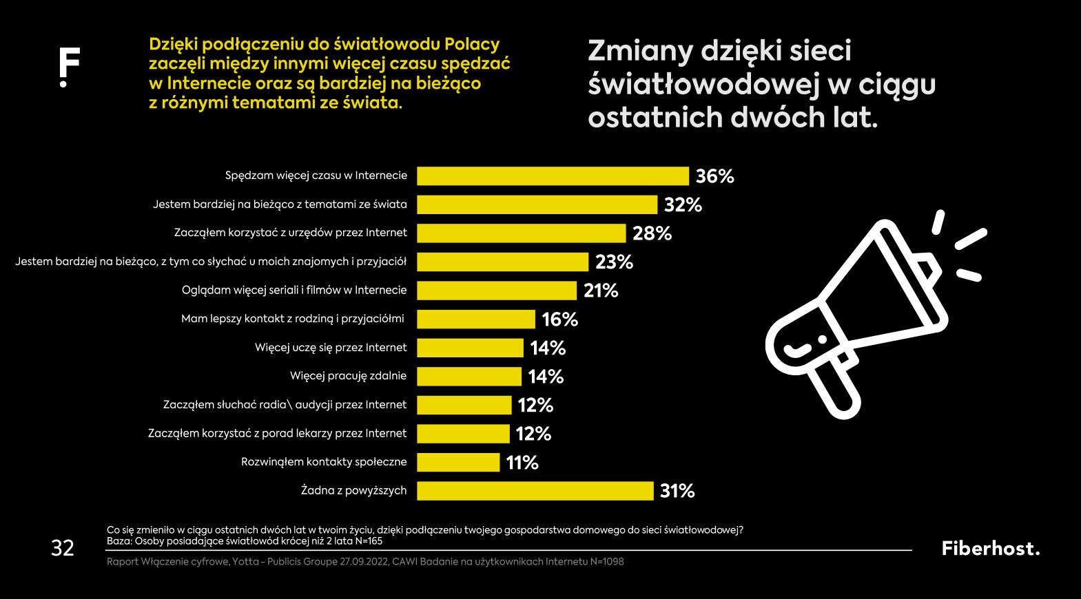 Nasze badanie pokazuje, że podłączenie do sieci światłowodowej naprawdę zmienia życie ludzi na lepsze. Niezwykle cieszy nas też fakt, że ankietowani zgadzają się z nami, że światłowód to zdecydowanie najlepszy rodzaj połączenia internetowego. Chcemy, żeby jak najwięcej osób w Polsce miało dostęp do tej technologii i chociaż wiele w tym obszarze zostało już zrobione, nie zamierzamy spoczywać na laurach, nie tylko jeśli chodzi o budowę, ale też akcje i działania edukacyjne– podsumowuje wyniki badania Marta Wojciechowska, Prezeska Zarządu Fiberhost S.A.