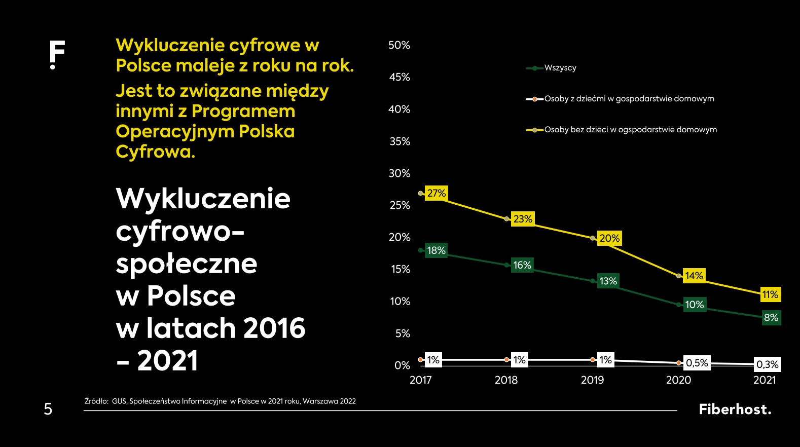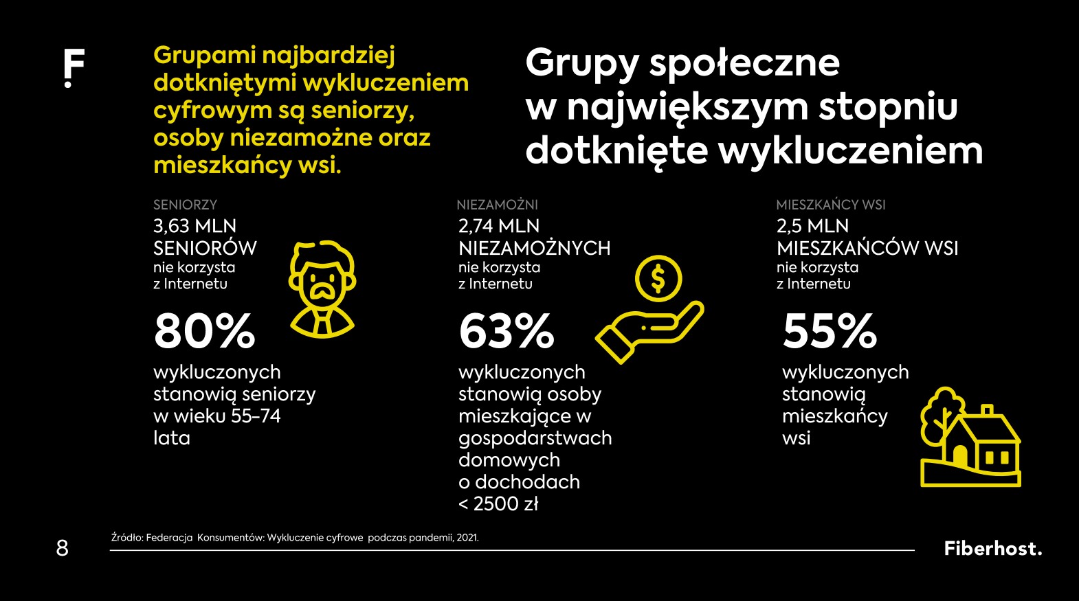 Podzielony na trzy części raport daje nam tez obraz wykluczenia cyfrowego w Polsce. Jest się jednak z czego cieszyć, bo jak pokazują dane GUS — problem ten systematycznie się zmniejsza. W 2017 roku wykluczonych cyfrowo Polaków było 18%. W 2021 roku – już 8%, do czego przyczyniła się budowa sieci światłowodowych w ramach Programu Operacyjnego Polska Cyfrowa na obszarach bez dostępu do przewodowej infrastruktury sieciowej. Dalsze inwestycje w infrastrukturę są jednak bardzo istotne, bo nadal jedną z grup najbardziej narażonych na wykluczenie cyfrowe są mieszkańcy wsi (64% spośród wykluczonych).