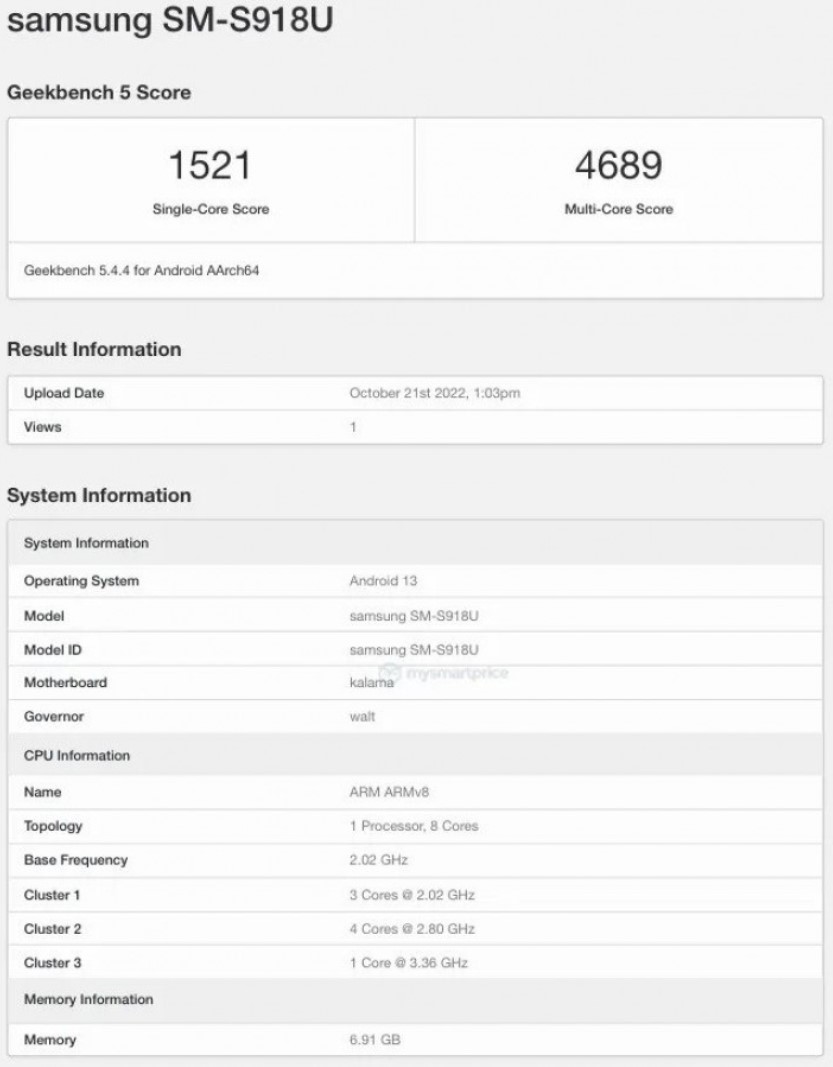 Wynik otrzymany w teście jest imponujący, zwłaszcza dla jednego rdzenia, bo mamy tutaj 1512 punktów, natomiast w teście wielordzeniowym osiągnięto 4689 punktów. Dla porównania przypomnimy, że kiedy Galaxy S22 Ultra napędzany przez Snapdragona 8 Gen 1 pojawił sie w Geekbench, udało mu się zgarnąć kolejno 1200 i 3200 punktów. Na wynikach testu widać też, że urządzenie będzie działało pod kontrolą Androida 13, a testowy wariant miał 8 GB pamięci RAM. Oprócz tej wersji spokojnie możemy spodziewać się także wariantu z przynajmniej 12 GB RAM.