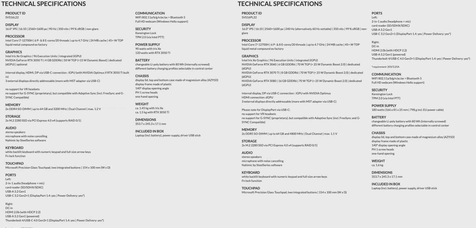 Przechodząc już do specyfikacji, wspomniany procesor Core i7-12700H można sparować ze wspomnianymi GPU NVIDIA (lub całkowicie z niego zrezygnować) oraz do 64 GB pamięci DDR4-3200 (Vision 16) lub DDR5-4800 (Vision Pro 16) i dwoma dyskami M2-2280 z interfejsem PCIe 4.0×4. Po stronie wyświetlaczy tańszy (od 1549 euro) model dzierży ekran LCD o rozdzielczości 2560 x 1600, jasności 350 nitów i częstotliwości odświeżania 90 Hz, a droższy (od 1899 euro) Vision 16 Pro ulepsza ten panel poprzez podbicie odświeżania do 240 Hz.