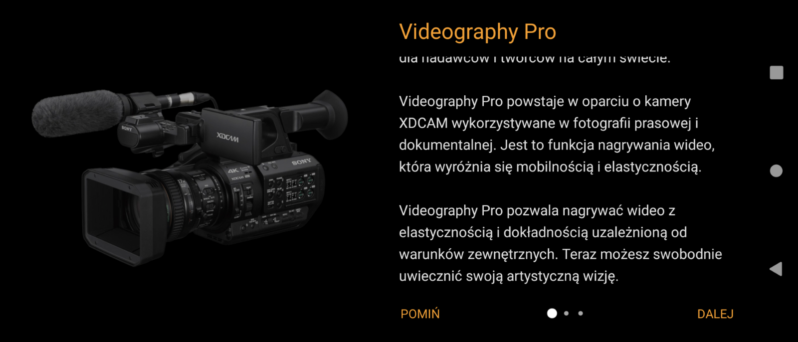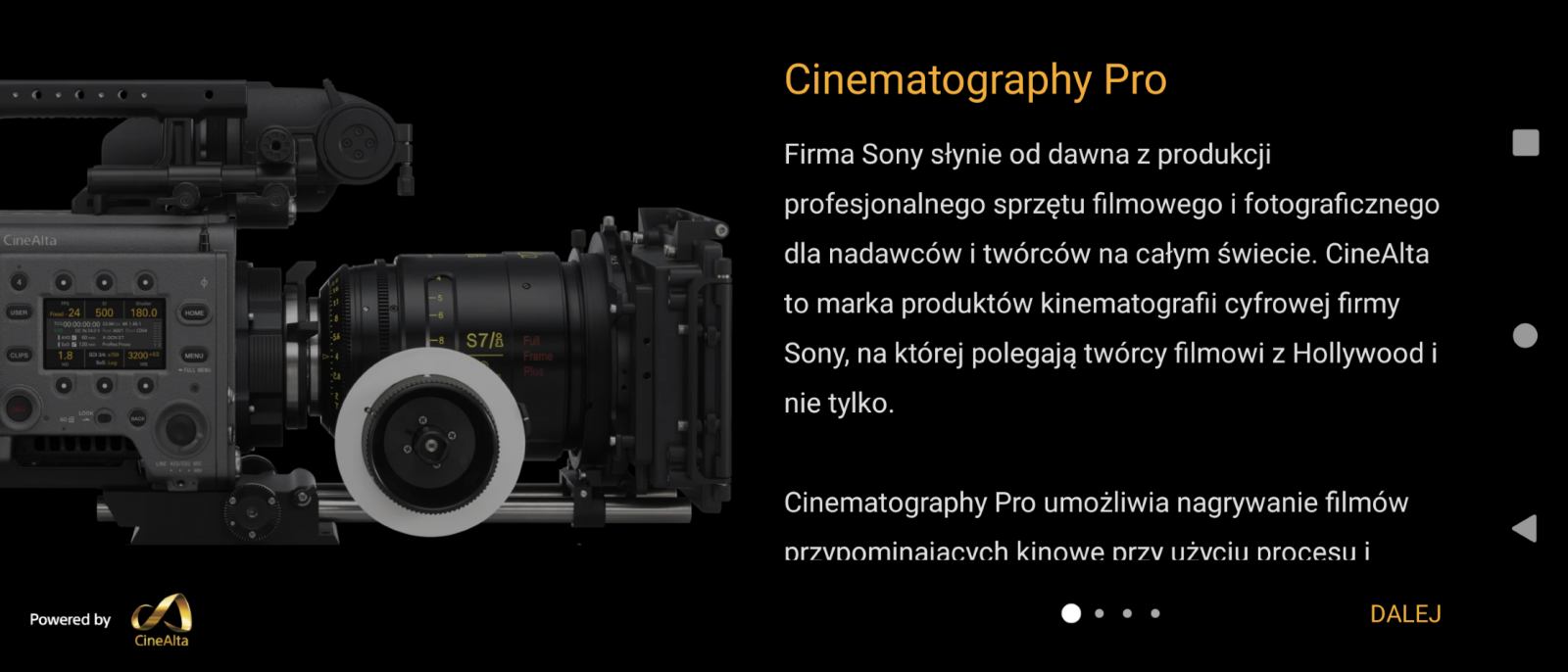 - Cinema Pro – aplikacja wzorowana na technologii profesjonalnej cyfrowej kamery Sony. Możemy tworzyć oraz edytować oddzielne projekty filmowe o mocno spersonalizowanych parametrach w tym nagrania 4K do 120 klatek na sekundę i proporcjach 21:9,