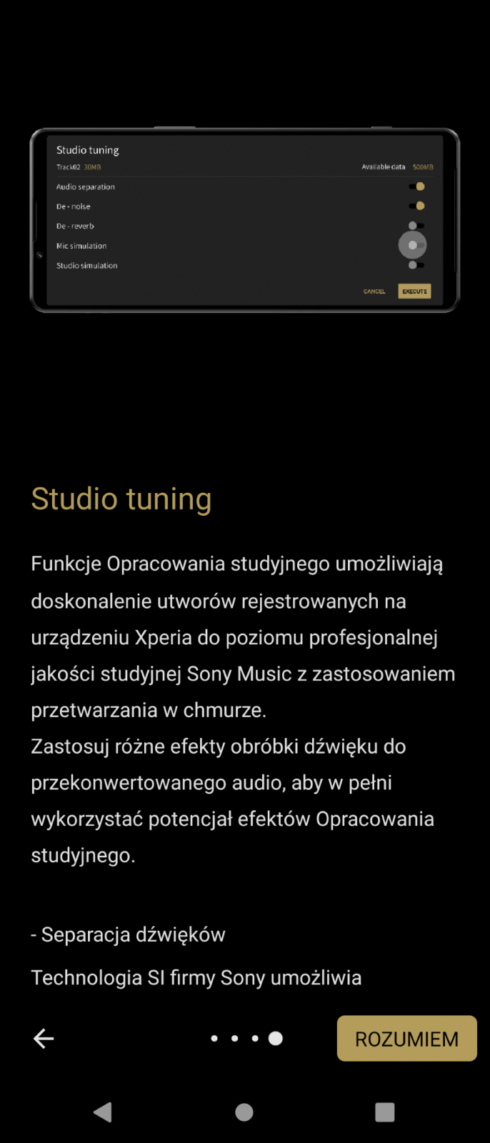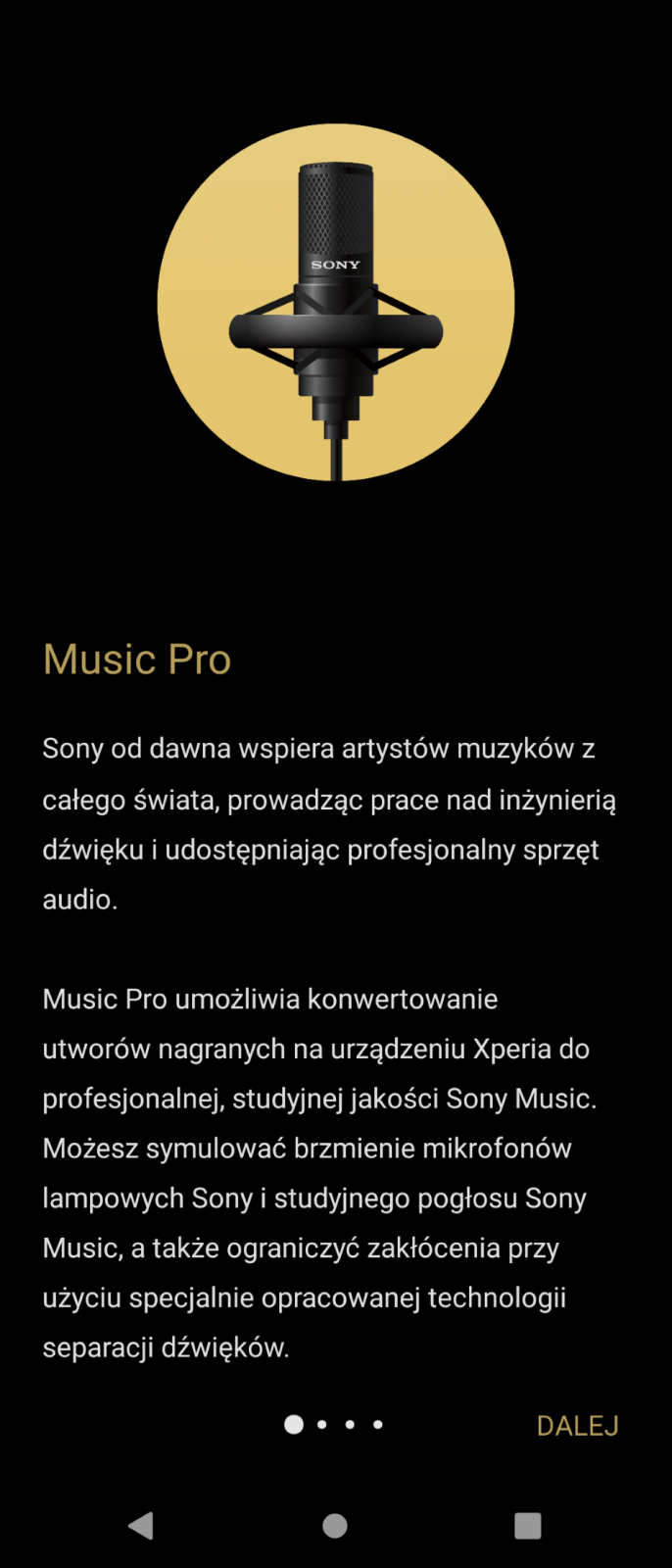 Pewien ukłon w stronę potencjalnego użytkownika i nabywcy stanowi aplikacja Tidal wariant Hi-Fi Plus z 90-dniową subskrypcją do wykorzystania oraz BRAVIA CORE czyli odpowiednik platformy VOD oferujący dostęp do wybranych treści multimedialnych w jakości zbliżonej do 4K czy Blu-ray (aplikacje możemy także znaleźć w niektórych telewizorach Sony). Po rejestracji powinniśmy otrzymać roczną subskrypcję, przynajmniej w teorii, bo nie zdecydowałem się na aktywacje tej usługi. Na koniec pozostał program „Music Pro” do zabawy w profesjonalne studio nagrań. Umożliwiające nagrywanie oddzielnych ścieżek dźwiękowych dla odpowiednich partii muzycznych, miksowanie oraz ich dowolną edycję.