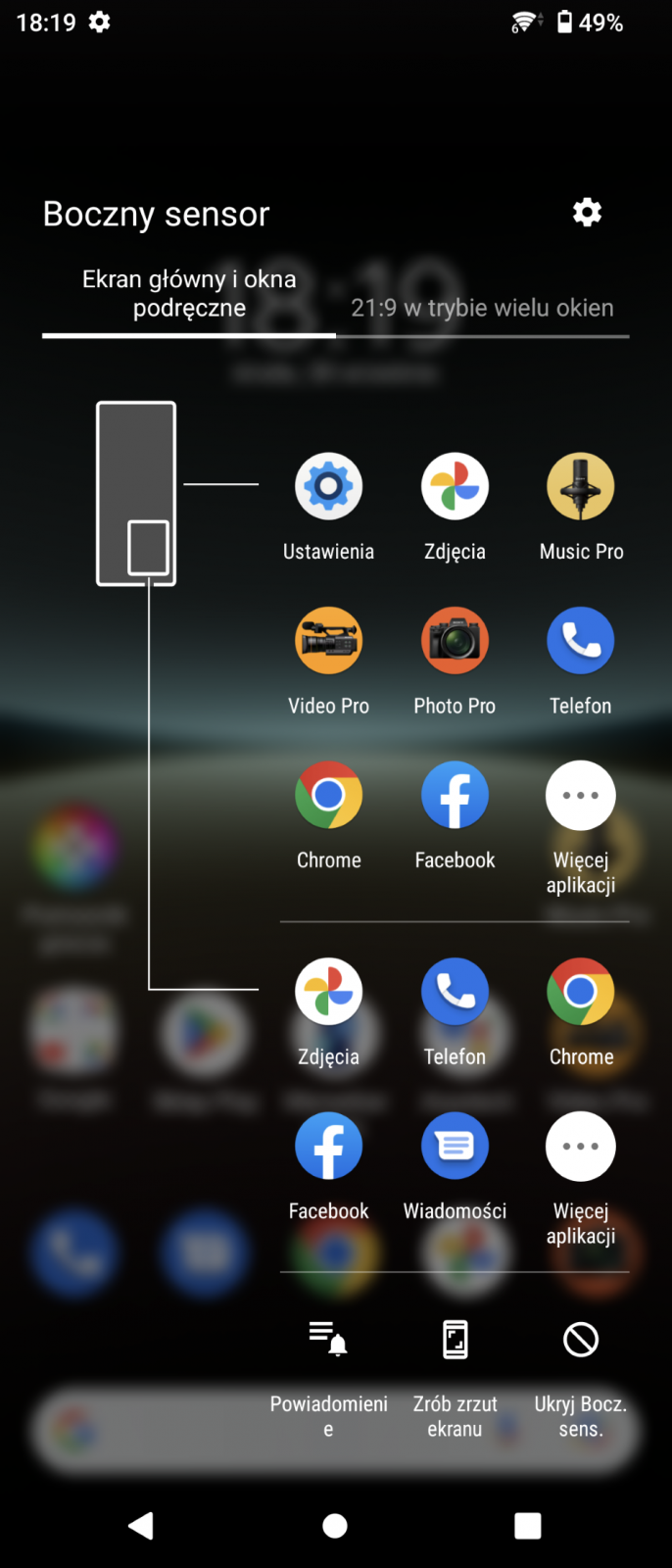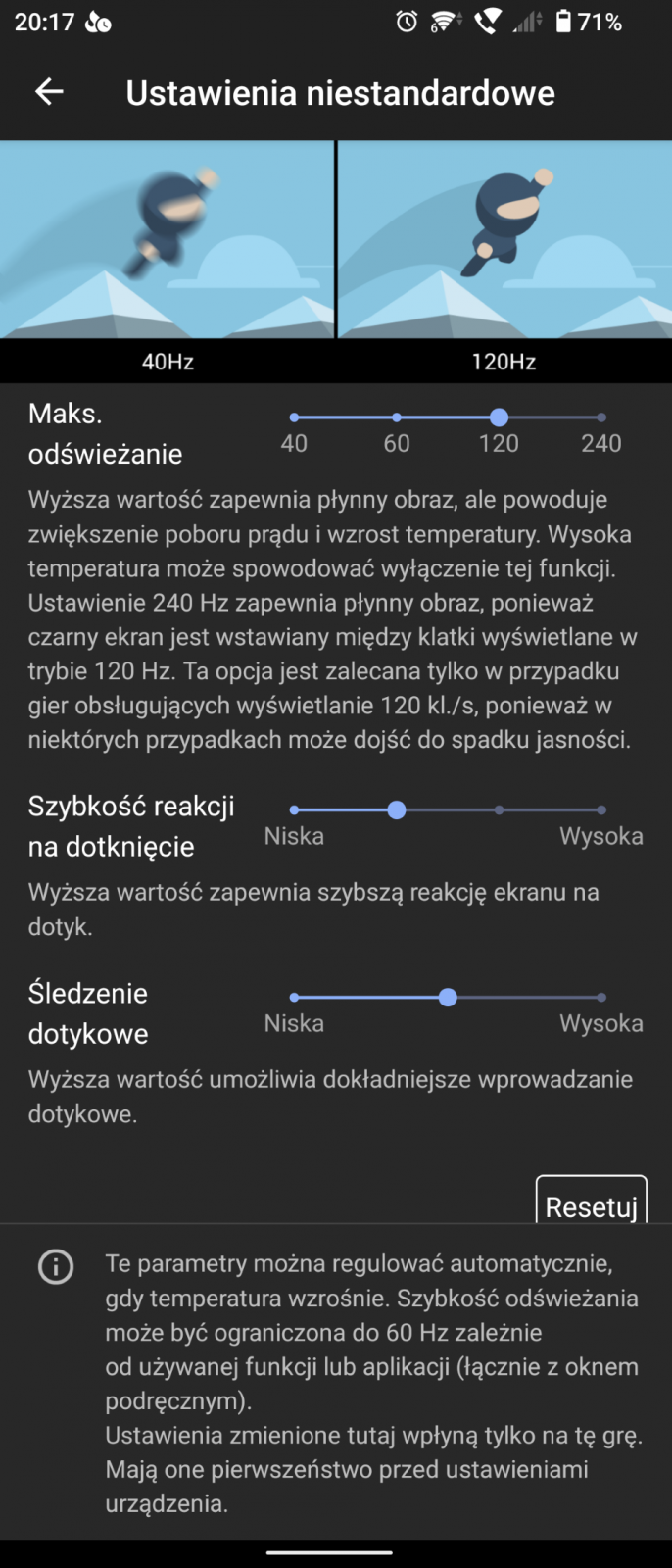 Z ciekawostek warto wymienić intuicyjny podział ekranu na dwie aplikacje, oczywiście dotyczy to głównie tych standardowych, a także rozbudowany „Pomocnik gracza” umożliwiający ustawienia odświeżania ekranu do wartości 240 Hz (poprzez wstawienie czarnych klatek w górną wartość 120 Hz) czy szybkość reakcji na dotyk.