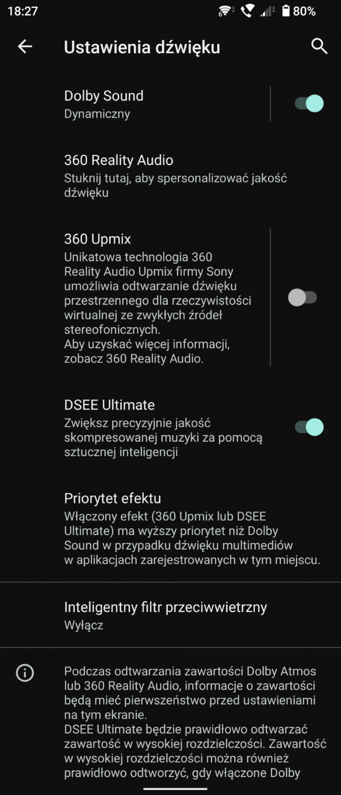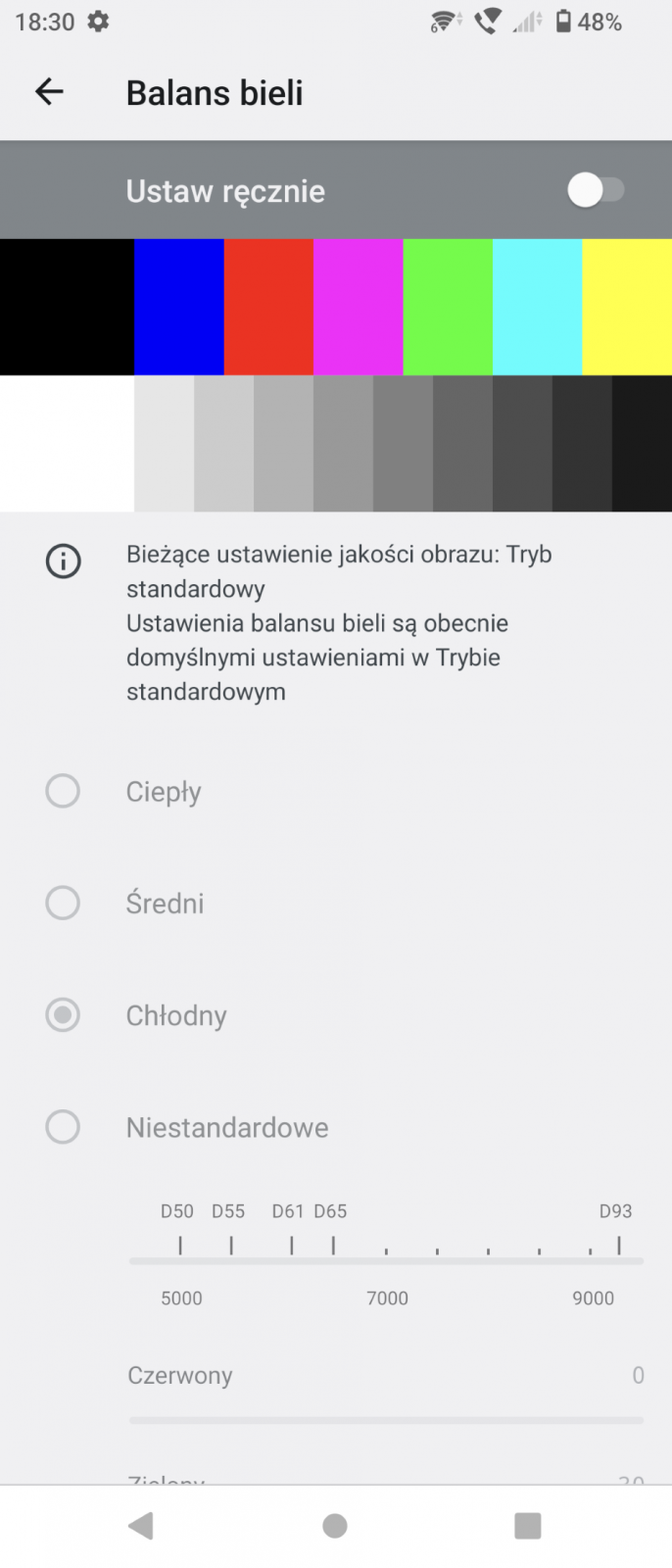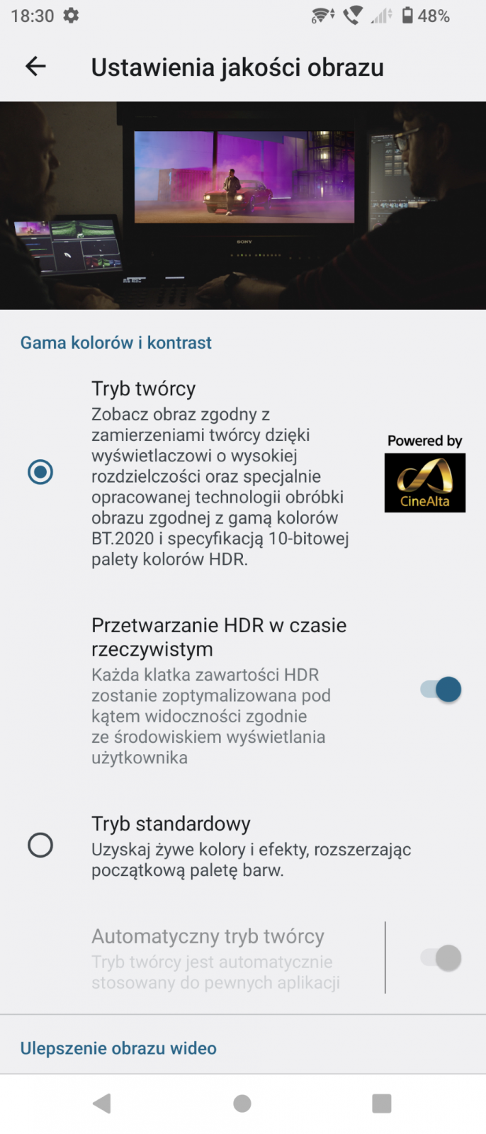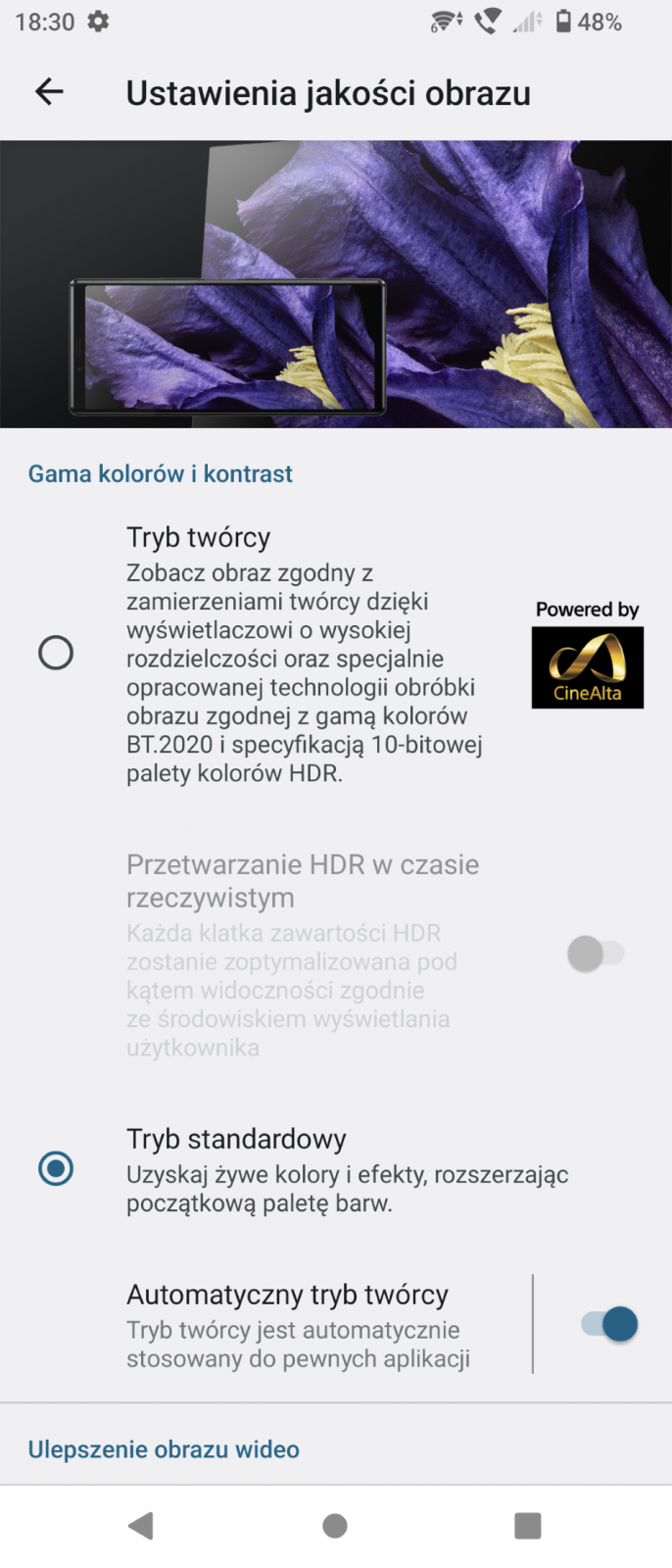 Ustawienia jakości obrazu mają do zaoferowania kilka rozbudowanych trybów z pełną możliwością definiowania drobnych detali. Jakby tego było mało, da się jeszcze profesjonalnie zmodyfikować balans bieli. Jasność maksymalna, jaką udało się uzyskać przy standardowych ustawieniach w trybie manualnym to 650 nitów a automatycznym to aż 950 nitów, co powinno zapewnić idealny obraz w praktycznie każdych warunkach. Widać, że Sony bardzo dba o jakość prezentowanego obrazu w swoich urządzeniach mobilnym, a przynajmniej w tym segmencie cenowym.