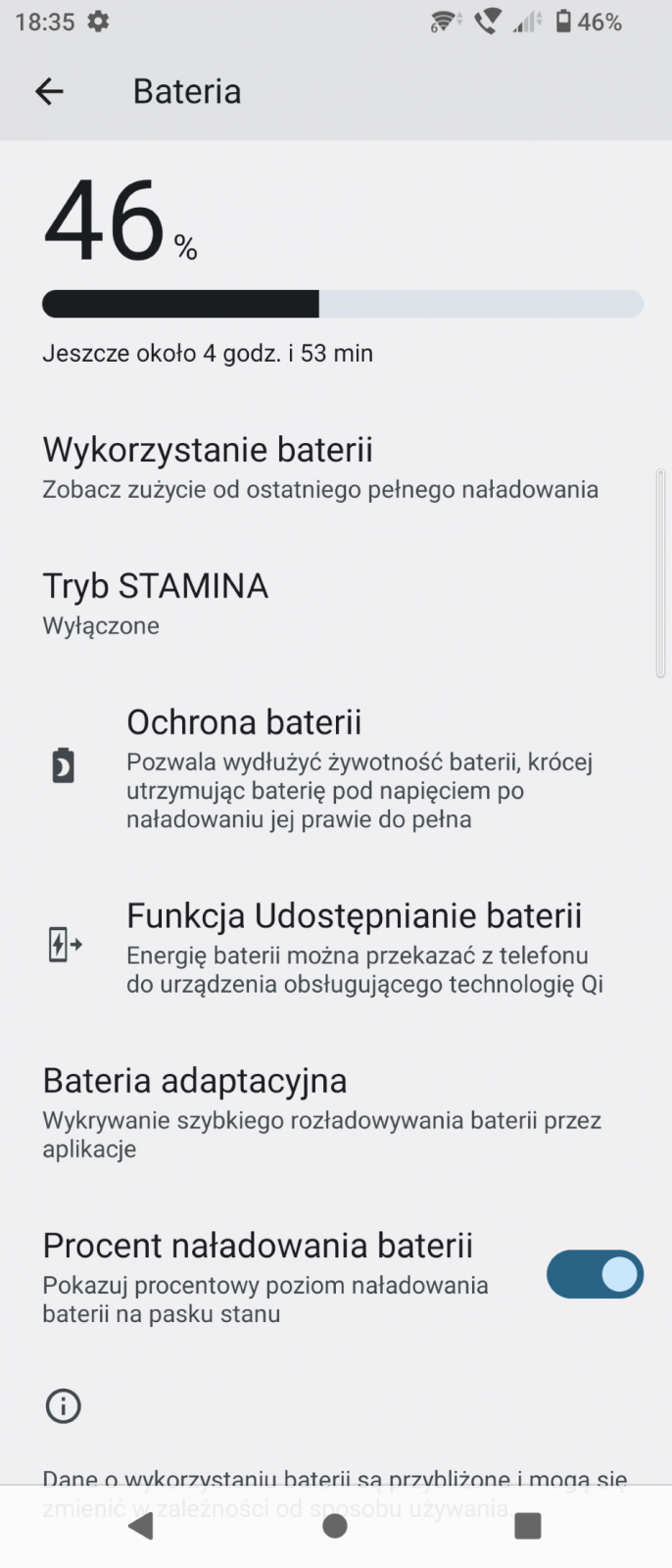 Sony wyposażył swój najnowszy produkt w dość pokaźną baterię 5000 mAh. Realny czas pracy wahał się w pomiędzy 46 a 52 godzinami, przy mieszanym trybie użytkowania z naciskiem na długie rozmowy głosowe. SOT (screen on time) potrafił osiągnąć prawie 9 godzin. Do tego mamy znany tryb STAMINA oferujący w zanadrzu kilka dodatkowych godziny kosztem pewnych ustępstw. Nie da się ukryć, że producent bardzo poważnie podszedł do kwestii czasu pracy.