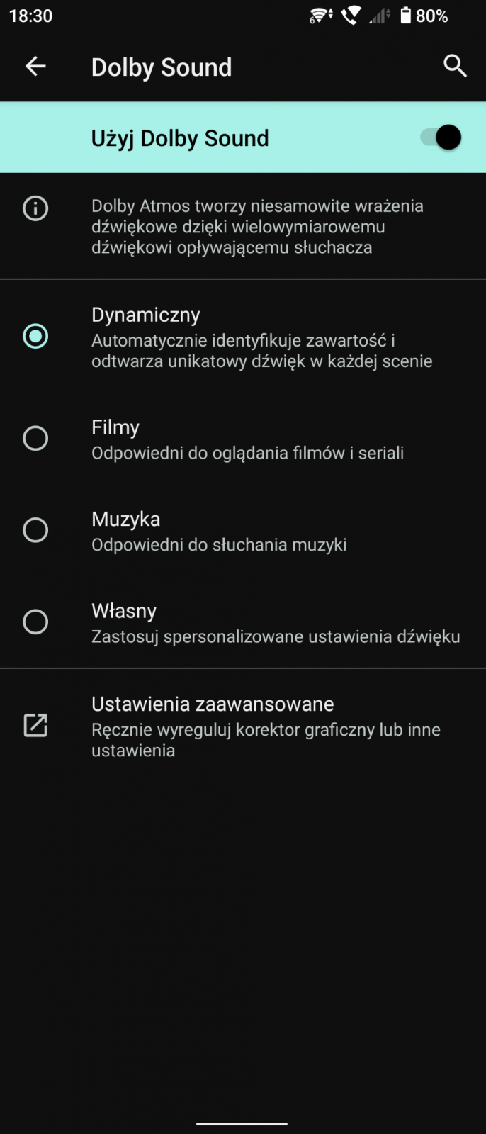 Głośniki stereo grają przyzwoicie i donośnie, dźwięk jest bardzo przyjemny i da się wyłapać poszczególne partie muzyczne. Otrzymujemy też szeroką gamę ustawień dodatkowych, począwszy od Dolby Sound z rozbudowanym equalizerem, a kończąc na dźwięku przestrzennym „360 Reality Audio”.