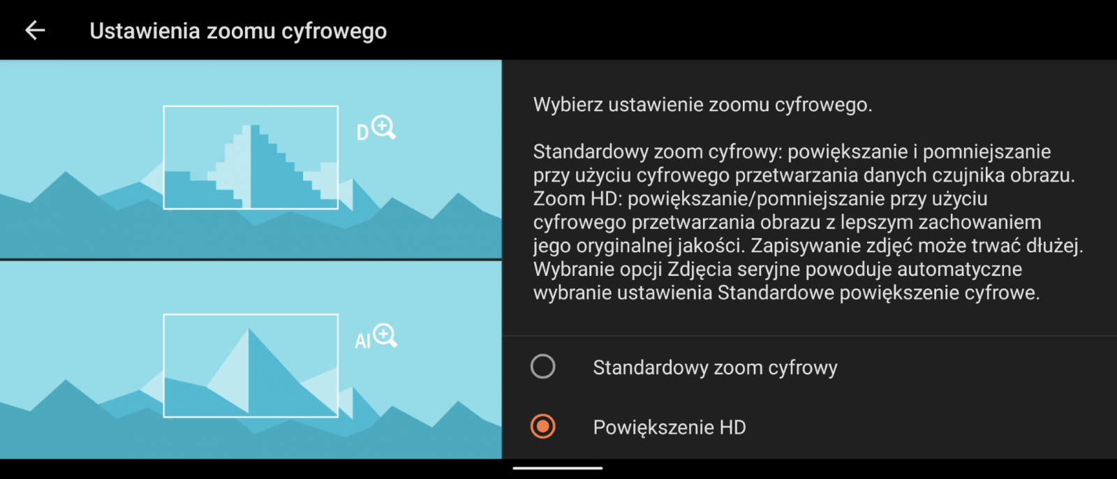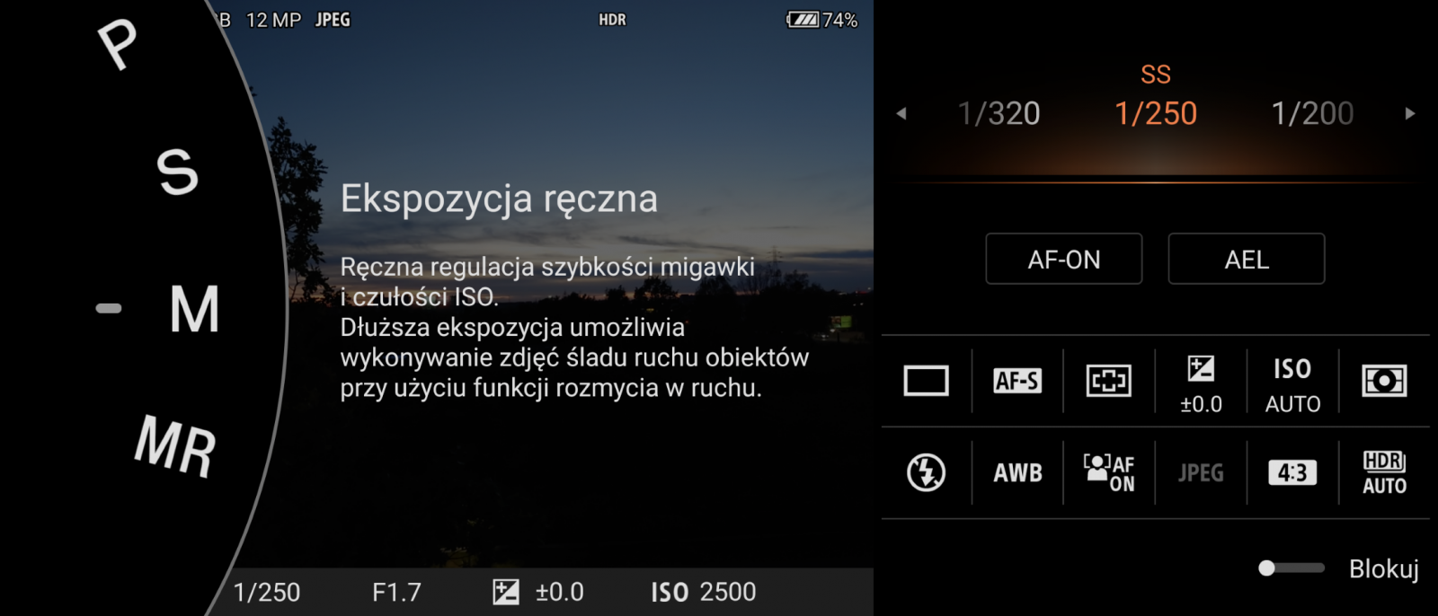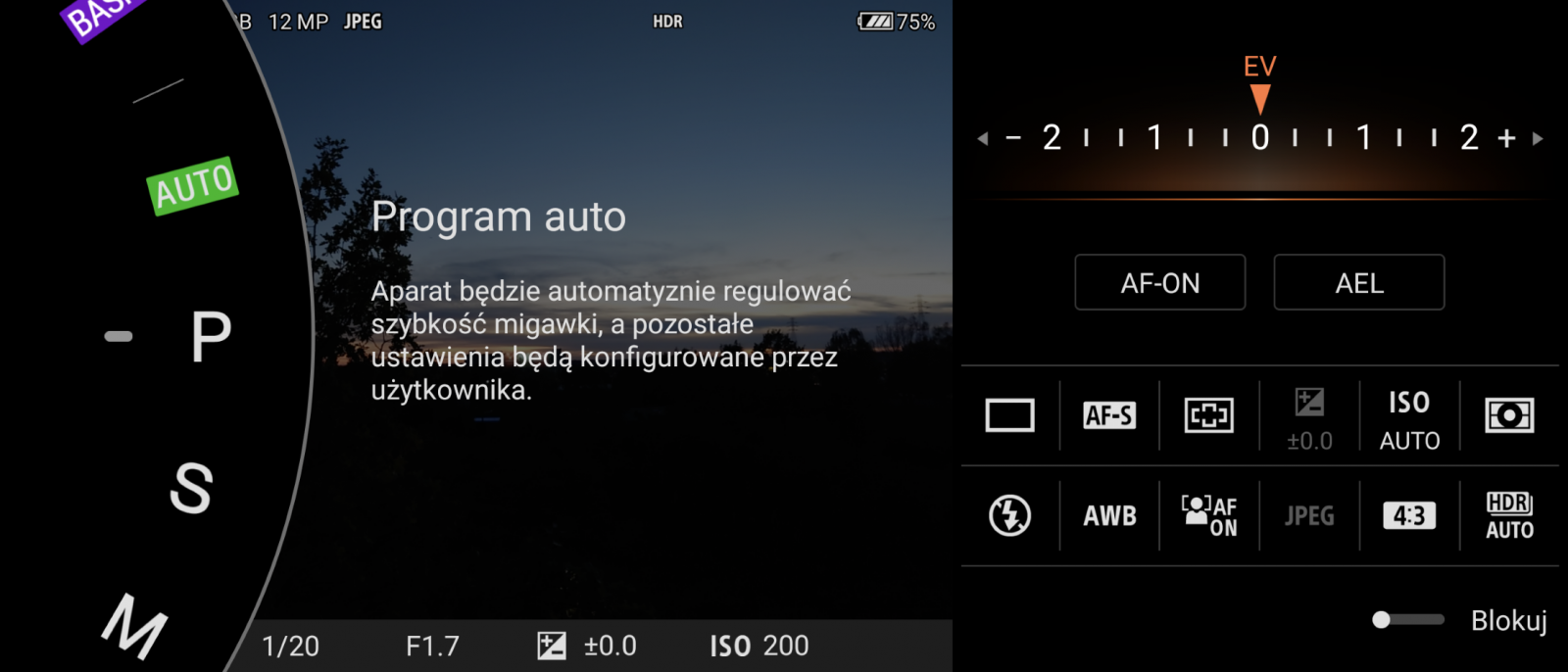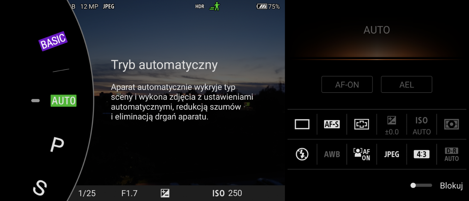 Do obsługi aparatu producent od dawna stosuje aplikację „Photo Pro” występującą w praktycznie każdym dostępnym obecnie smartfonie Sony. Ma przypominać interfejsem klasyczne cyfrowe aparaty fotograficzne. Takie rozwiązanie ma swój urok, ale pomiędzy ustawieniami automatycznymi a manualnym nie ma opcji pośrednich, takich jak choćby możliwość wyboru konkretnej sceny (tryb nocny itp.). Z drugiej strony osoby oczekujące czegoś więcej niż machinalne naciskanie migawki poczuję się jak ryba w wodzie. Otrzymujemy niezliczoną ilość opcji, po części zintegrowanych z dedykowanym dwustopniowym mechanicznym przyciskiem migawki.