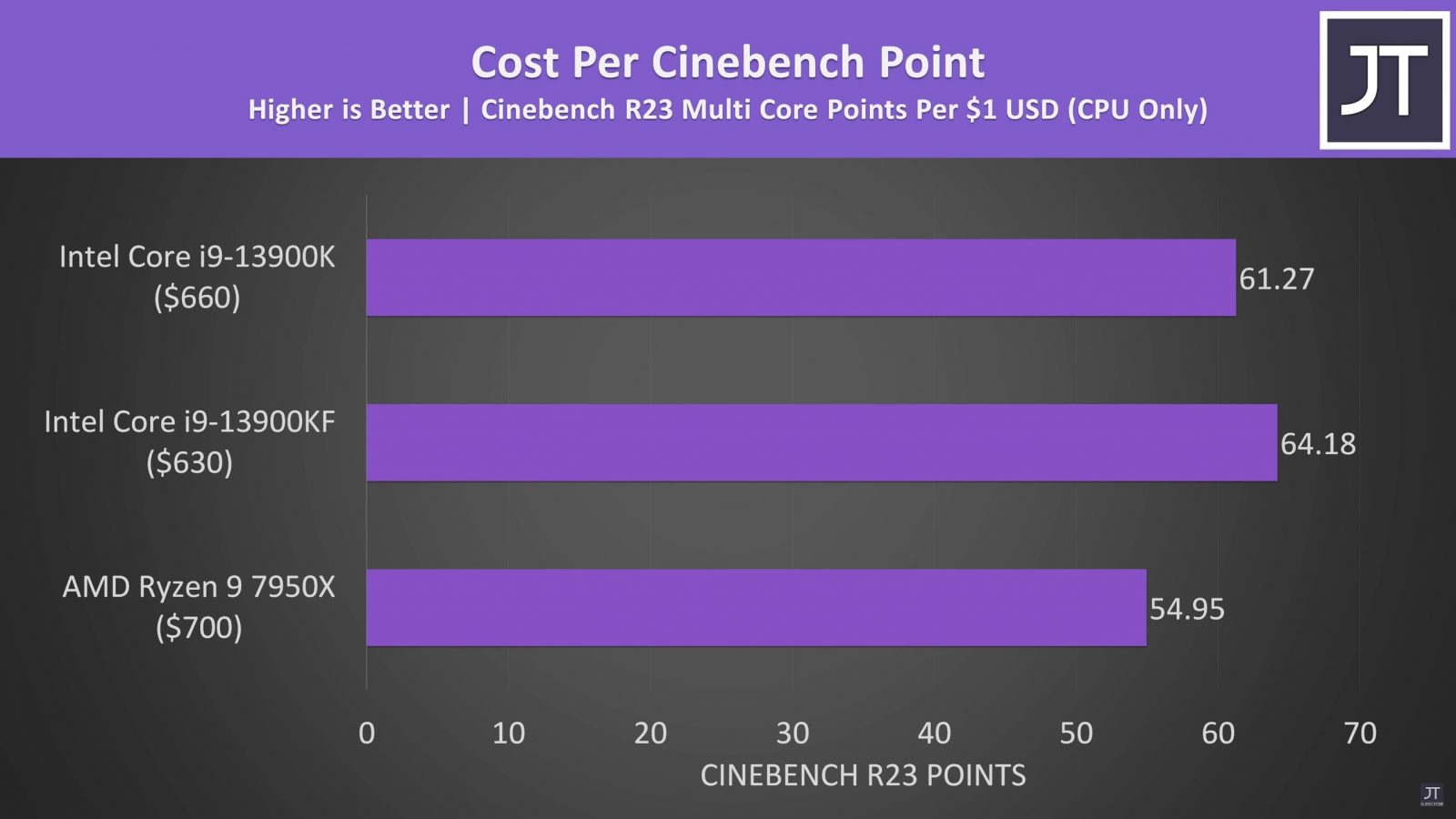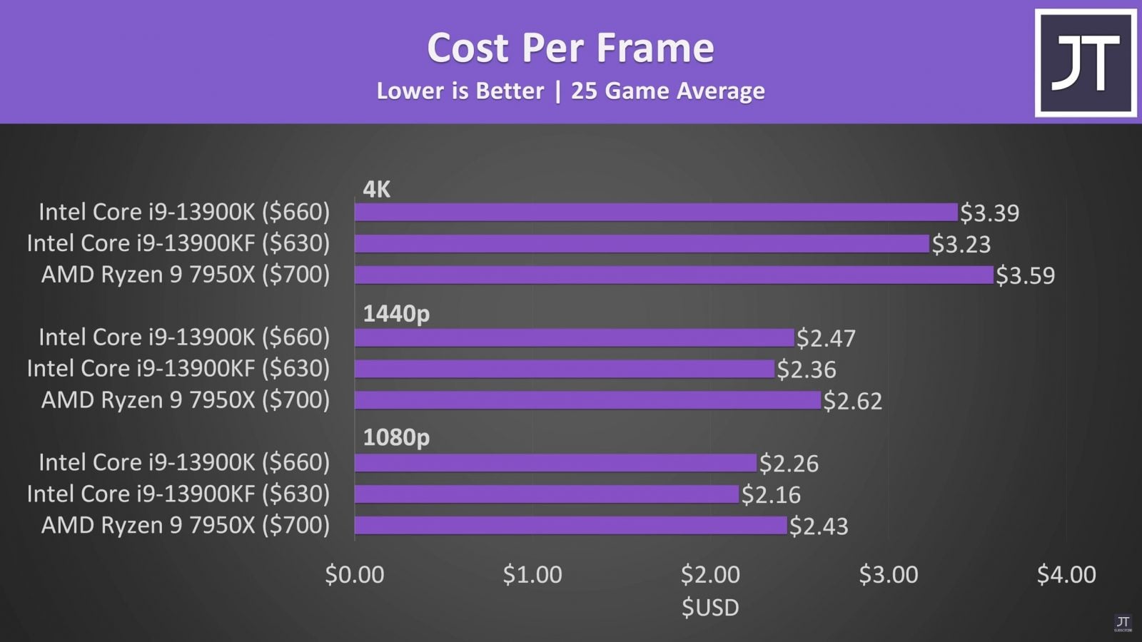 Porównując ceny nowych procesorów od razu rzuci się nam w oczy, że oferta przygotowana przez AMD jest droższa w najwyższym segmencie, co dotyczy Ryzena 9 7950X, Ryzena 9 7900X oraz 7600X, kosztujących odpowiednio 4050, 3200 i 1700 złotych. Oferta Intela wypada w tej kwestii lepiej. Cena Core i9-13900 wynosi 3499 i 3399 za wersję bez iGPU, Core i7-13700 kosztuje już odpowiednio 2499 i 2399 zł, a Core i5-13600 1869 oraz 1749 zł. Ze schematu opłacalności wyłamuje się tylko Core i5-13600 oraz Ryzen 7600X, ale ma to swój powód.