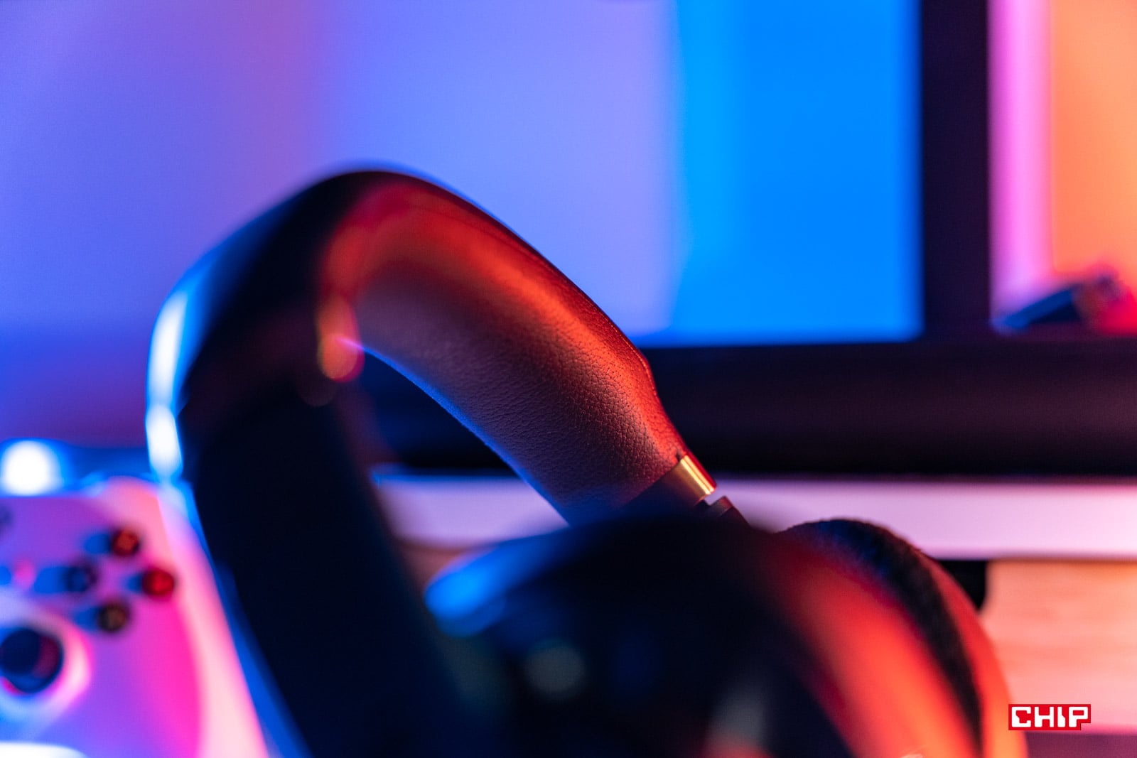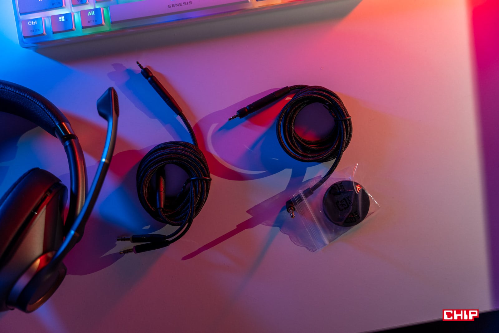 Na lewym pałąku znalazło się też złącze na jeden z dwóch przewodów o solidnym wzmocnieniu przy samej końcówce. Oba przewody wzmocniono z wykorzystaniem nylonowej osłonki, a jako że są elastyczne i lekkie, trudno się do nich doczepić. Można jednak doczepić się do jednego – braku możliwości złożenia muszli o 90 stopni, aby uprościć ich transport.