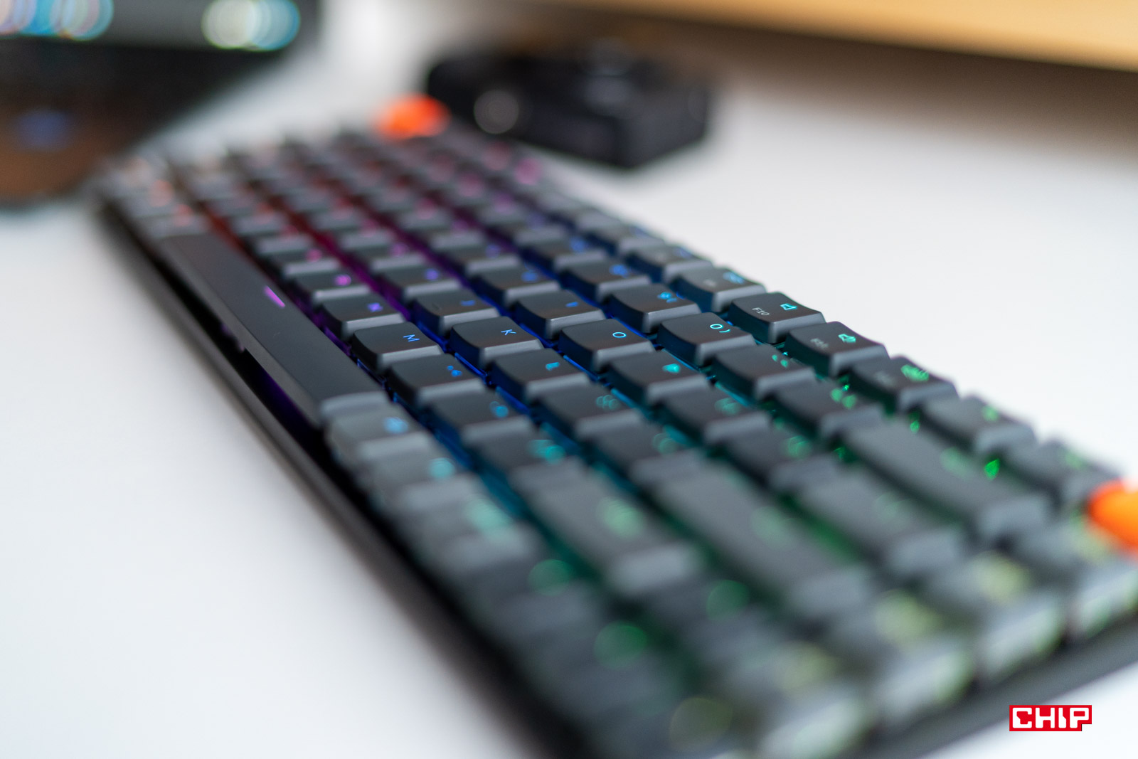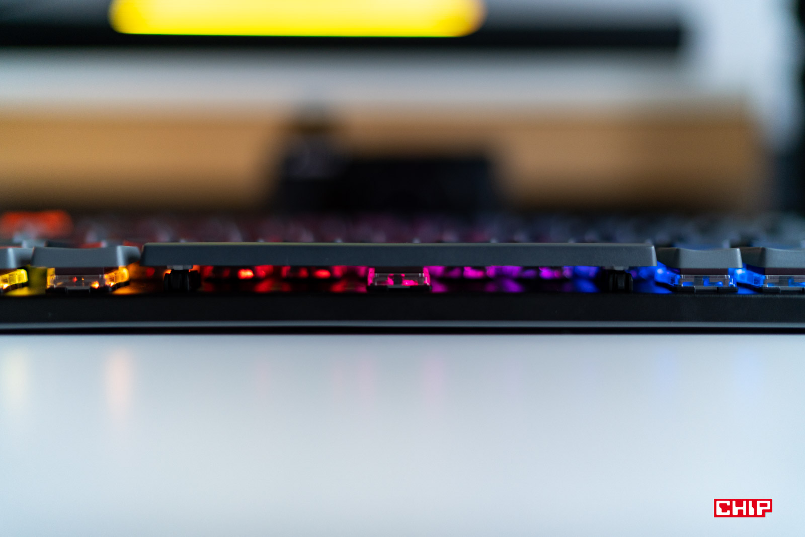 Klawiatura oferuje optyczne przełączniki w kolorze brązowym. Obrazując to w najprostszy możliwy sposób, przełączniki optyczne są szybsze od mechanicznych, bo do wywołania efektu nie potrzebują fizycznego kontaktu elementów przycisku. Teoretycznie mogłyby działać całkowicie dotykowo, ale to raczej nie byłoby zbyt wygodne. Mogą więc imitować ruch dowolnych klawiszy mechanicznych. Aktywacja klawisza następuje teoretycznie po wciśnięciu go o 1,1 mm, a maksymalny tor ruchu to 2,5 mm. Skok jest niewielki, co w połączeniu z bardzo przyjemnym sprężynowaniem pozwala na bardzo szybkie pisanie.