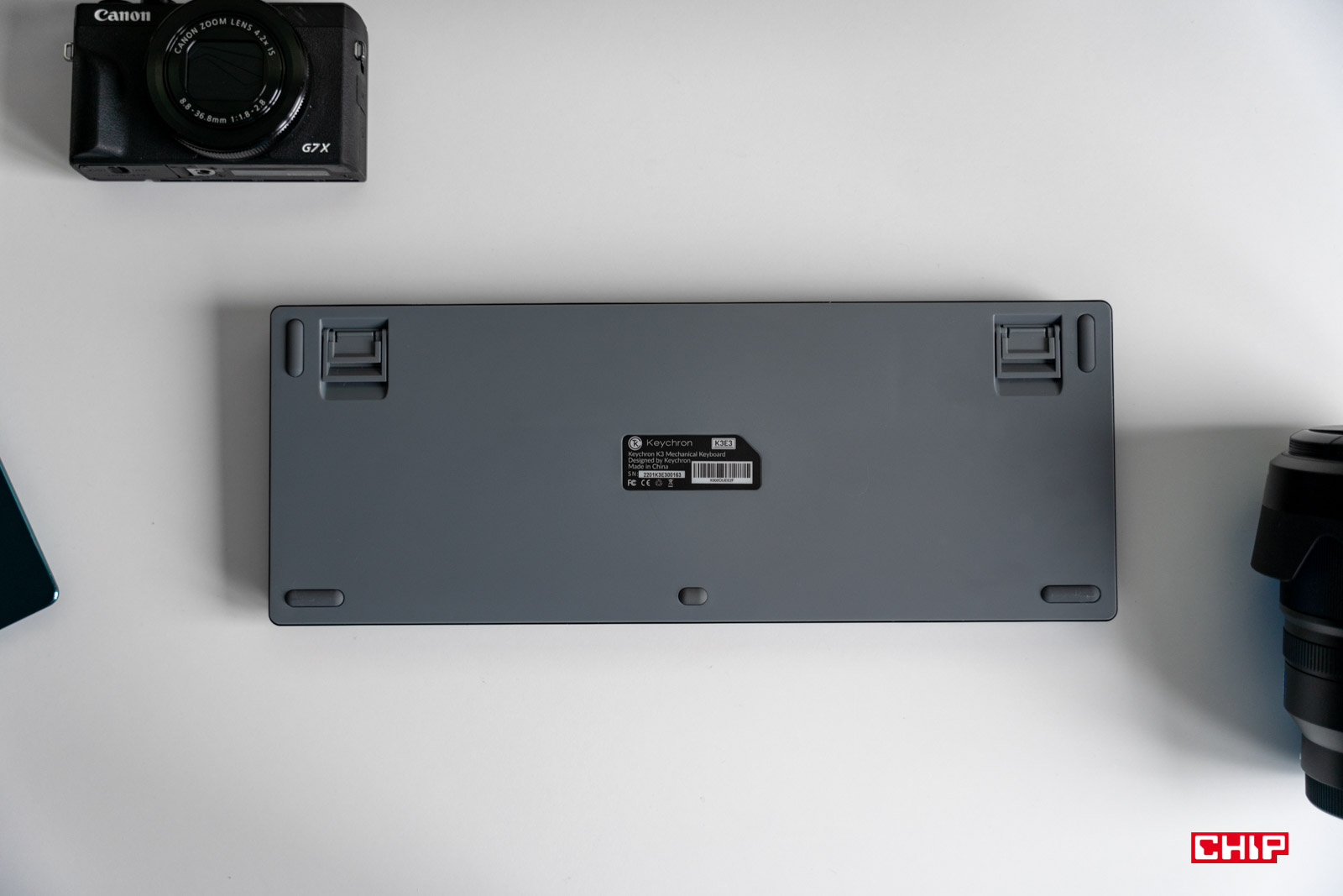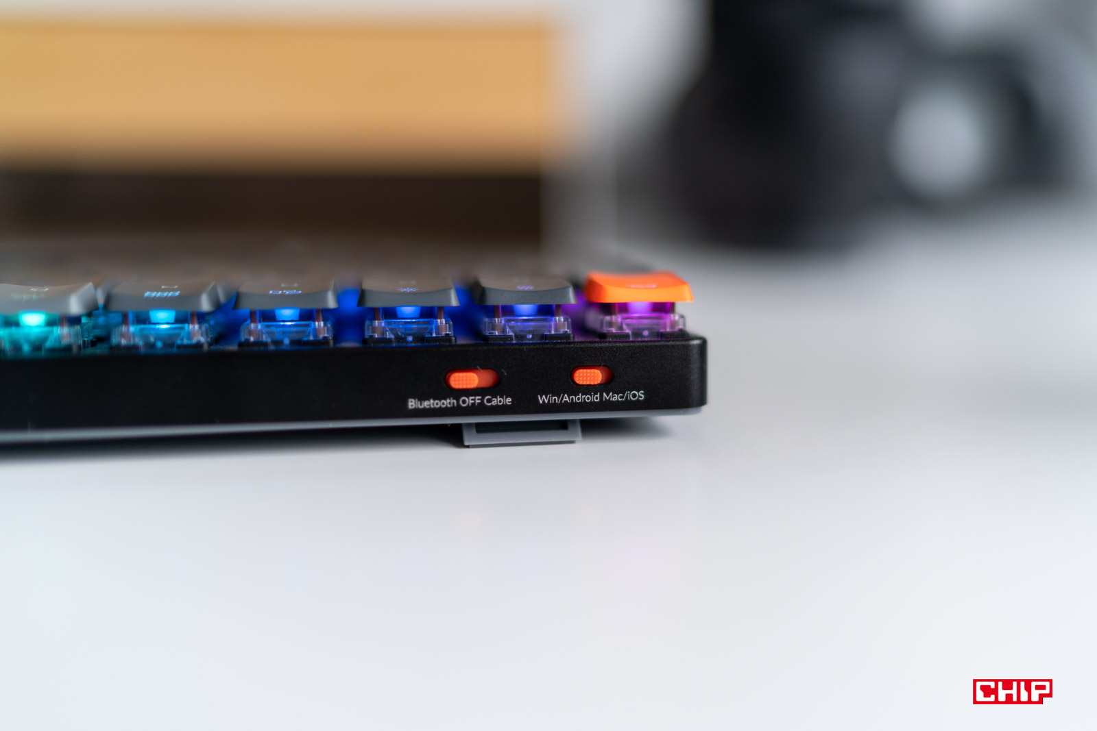 Klawisze są plastikowe, twarde i ładnie wyprofilowane. Tutaj też ciężko jest się do czegoś przyczepić. Jeśli chodzi o dodatkowe elementy, to mamy tu wspomniane podwójne rozkładane stopki w tyle konstrukcji (wrócimy do nich), port USB-C na tylnej krawędzi oraz dwa przełączniki. Pierwszy to włącznik przełączający też tryb pracy (kablowy lub Bluetooth), a drugi przełącza tryb pracy pomiędzy Windowsem, Androidem i komputerami MAC. Bardzo ważny przełącznik, o którym kompletnie zapomniałem i zastanawiałem się chwilę, czy to ja jestem głupi, czy klawiatura nie chce działać prawidłowo z Windowsem. Także tak… to była ta pierwsza opcja.