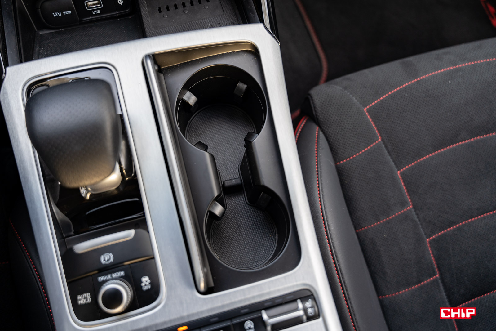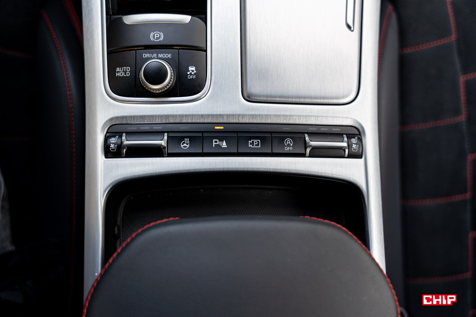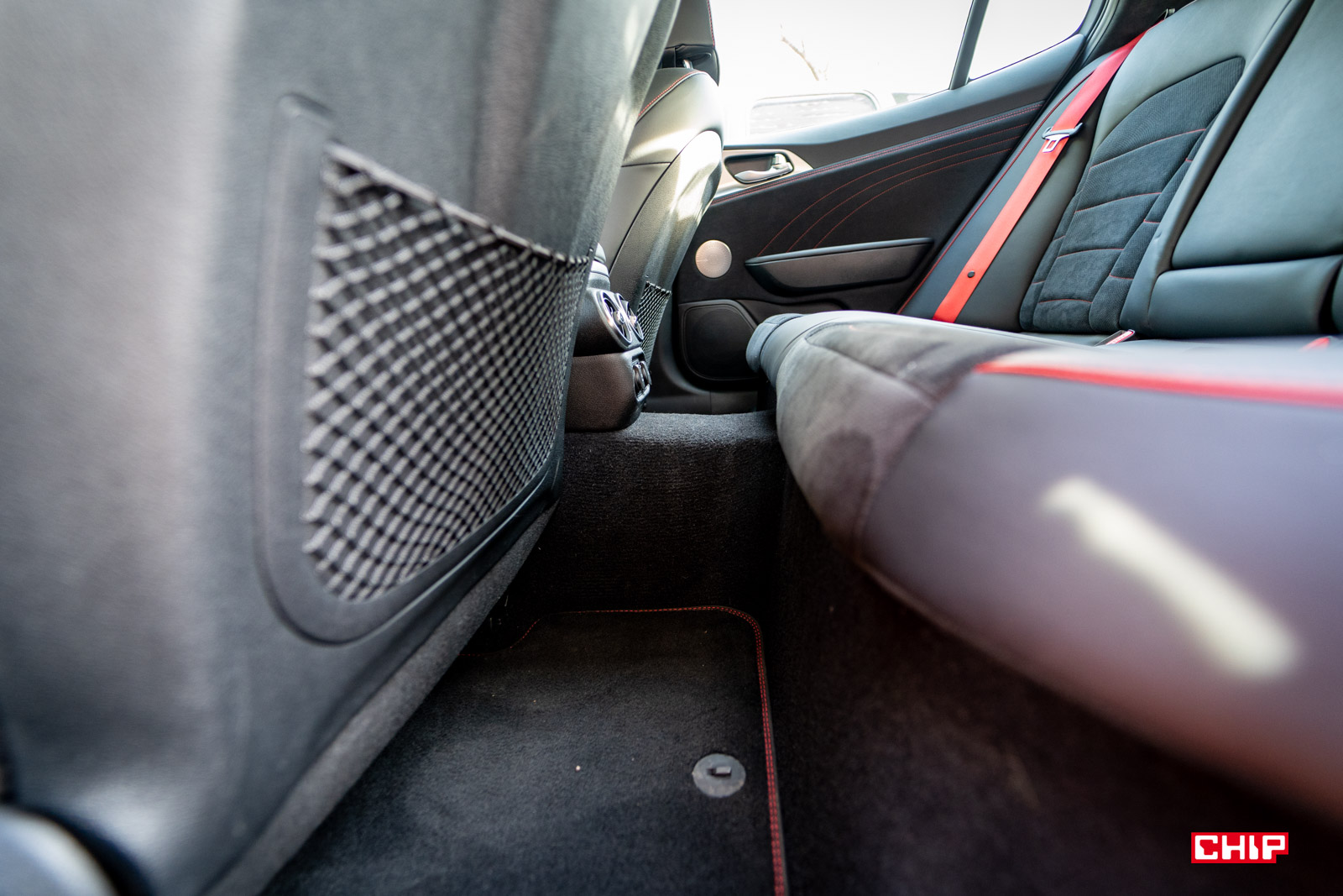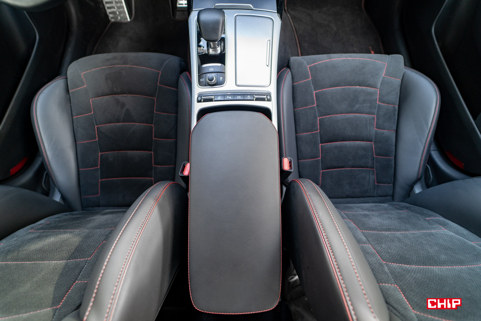 Gorzej jest z tyłu, bo tunel bardzo skutecznie uniemożliwia wygodne siedzenie na środkowym miejscu. Pomaga mu w tym bardzo twarde oparcie chowające podłokietnik z uchwytami na napoje. Kogoś na chwilę można tam posadzić w razie potrzeby, ale ogółem Stingera należy traktować jak auto czteroosobowe. Osoby siedzące z tyłu nie powinny mieć powodów do narzekania. Tutaj długość auta daje o sobie znać, bo miejsca jest bardzo dużo w praktycznie każdej płaszczyźnie, a do tego fotele są podgrzewane. Zaryzykowałbym nawet stwierdzenie, że pasażer z tyłu może mieć nawet wygodniej niż z przodu, gdyby nie fakt, że prędkość i zakręty z tyłu czuć znacznie mocniej.