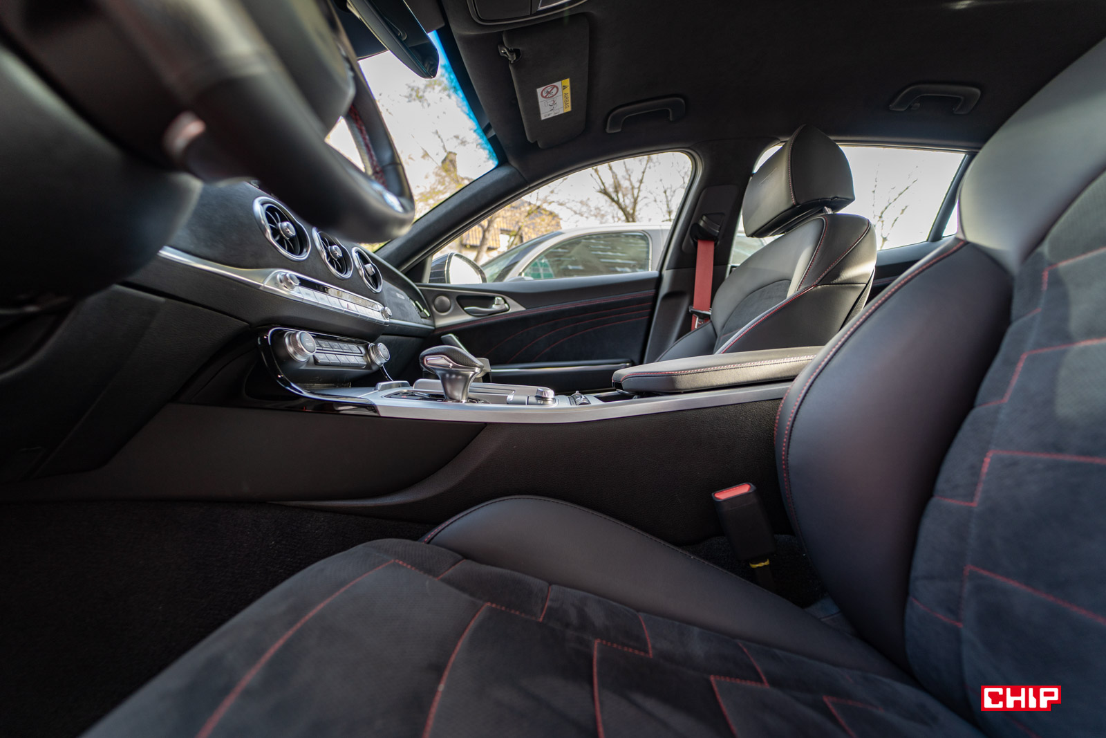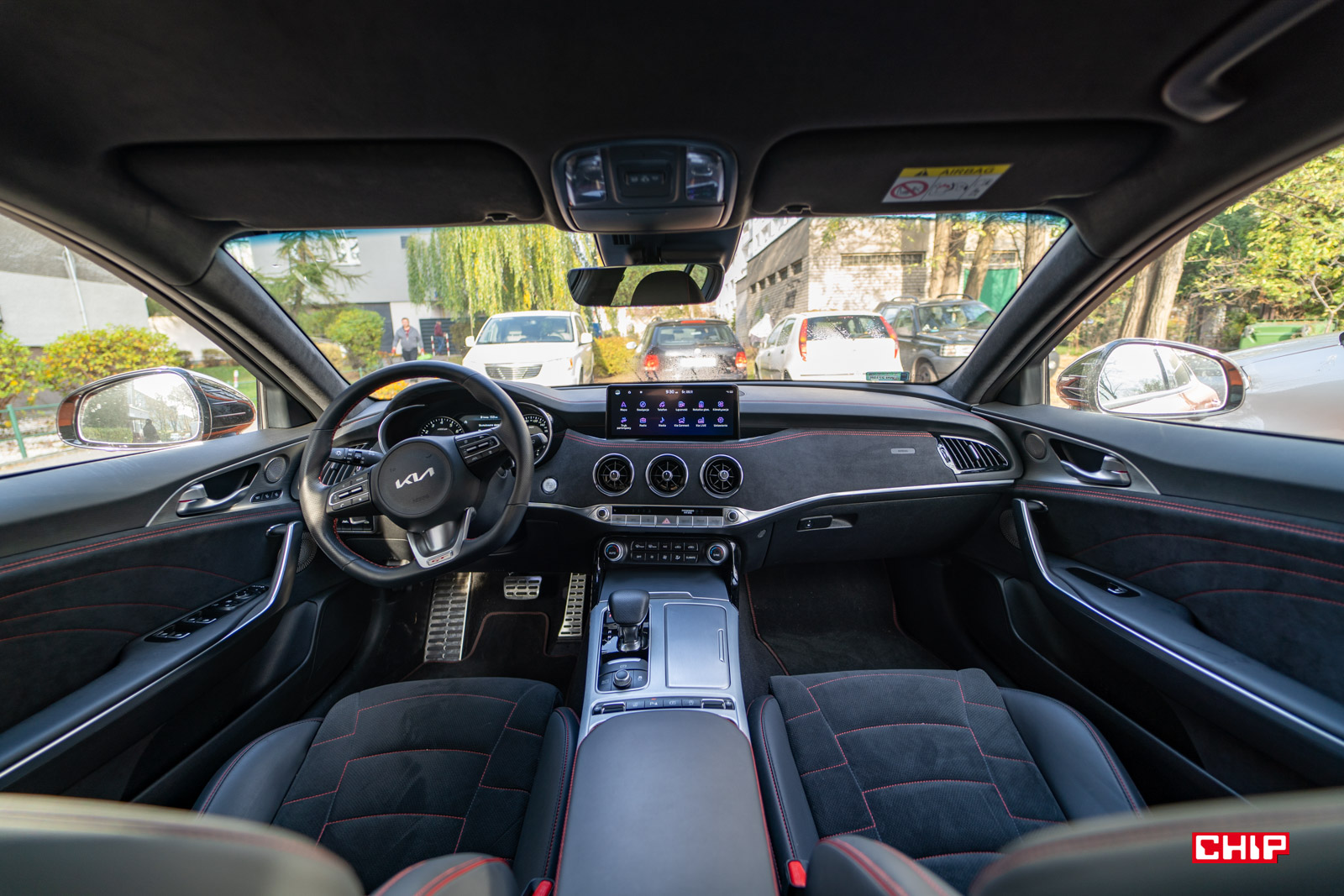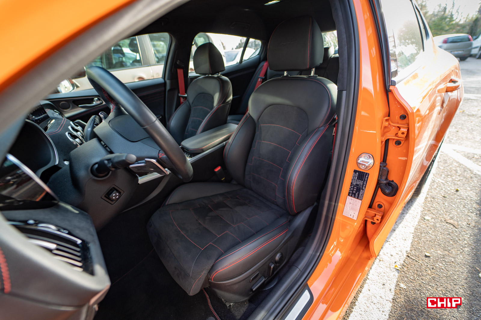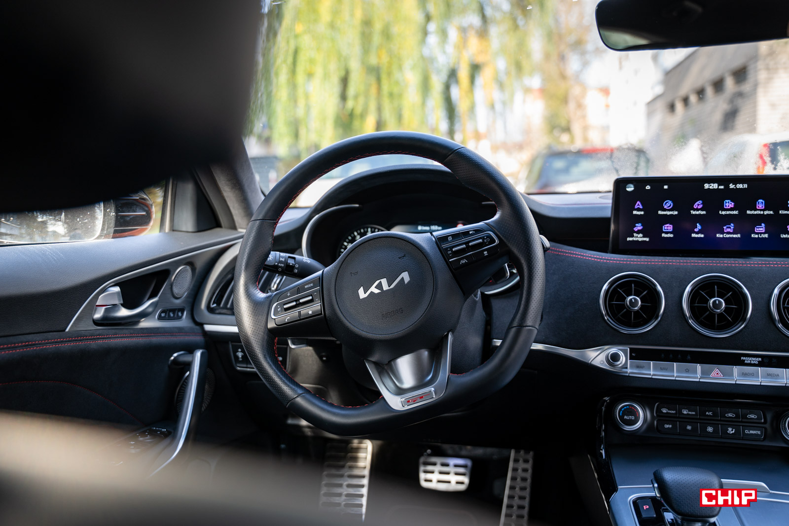 Siedzi się nisko albo bardzo nisko. W zależności od tego, jak ustawimy sobie wysokość fotela. Pozycja z dupą na asfalcie jest jak najbardziej możliwa. Co ważne, ze Stingera da się normalnie wysiąść bez wyglądania jak osoba z poważną kontuzją biodra. Wsiadanie to jest już trochę skok w przepaść, bo trzeba się dosyć głęboko zapaść we wnętrzu. Takie uroki sportowych aut, ale tutaj jest to naprawdę bardzo cywilizowane. Ale…