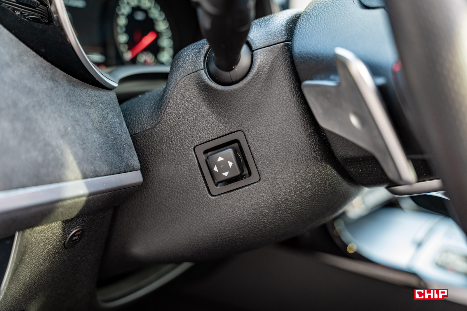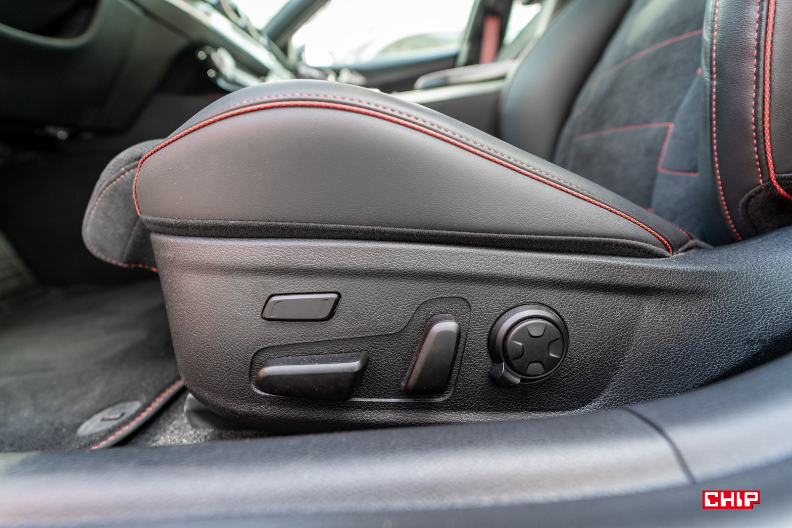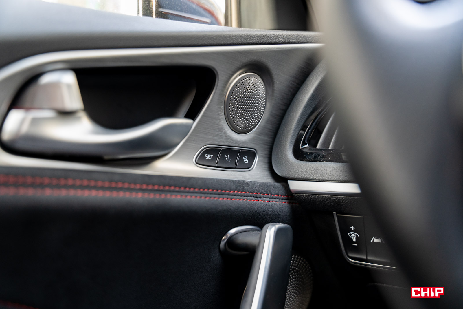 Zacznijmy od najważniejszego, czyli osób siedzących z przodu. Fotele mają sportowy charakter, ale są miękkie i bardzo wygodne. Po dłuższej trasie pierwszą myślą na pewno nie będzie szukanie numeru telefonu do fizjoterapeuty. W bardziej uprzywilejowanej pozycji jest kierowca, bo oprócz elektronicznego sterowania pozycją fotela i poziomem wypchnięcia odcinka lędźwiowego (ma to też pasażer) ma również automatycznie odsuwany fotel, co ułatwia wsiadanie oraz usztywnianie boczków. To można ustawić ręcznie albo też zdać się na automat usztywniający boki po aktywacji trybu Sport. Co nie oznacza, że pasażer na zakrętach będzie latać na boki. Jest trzymany bardzo solidnie, ale troszkę słabiej niż kierowca.