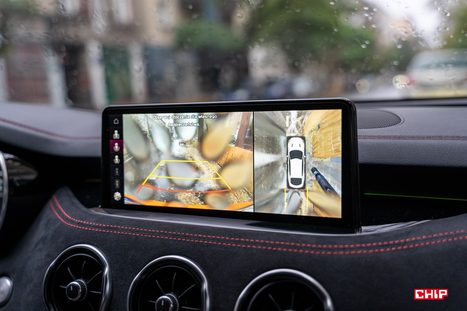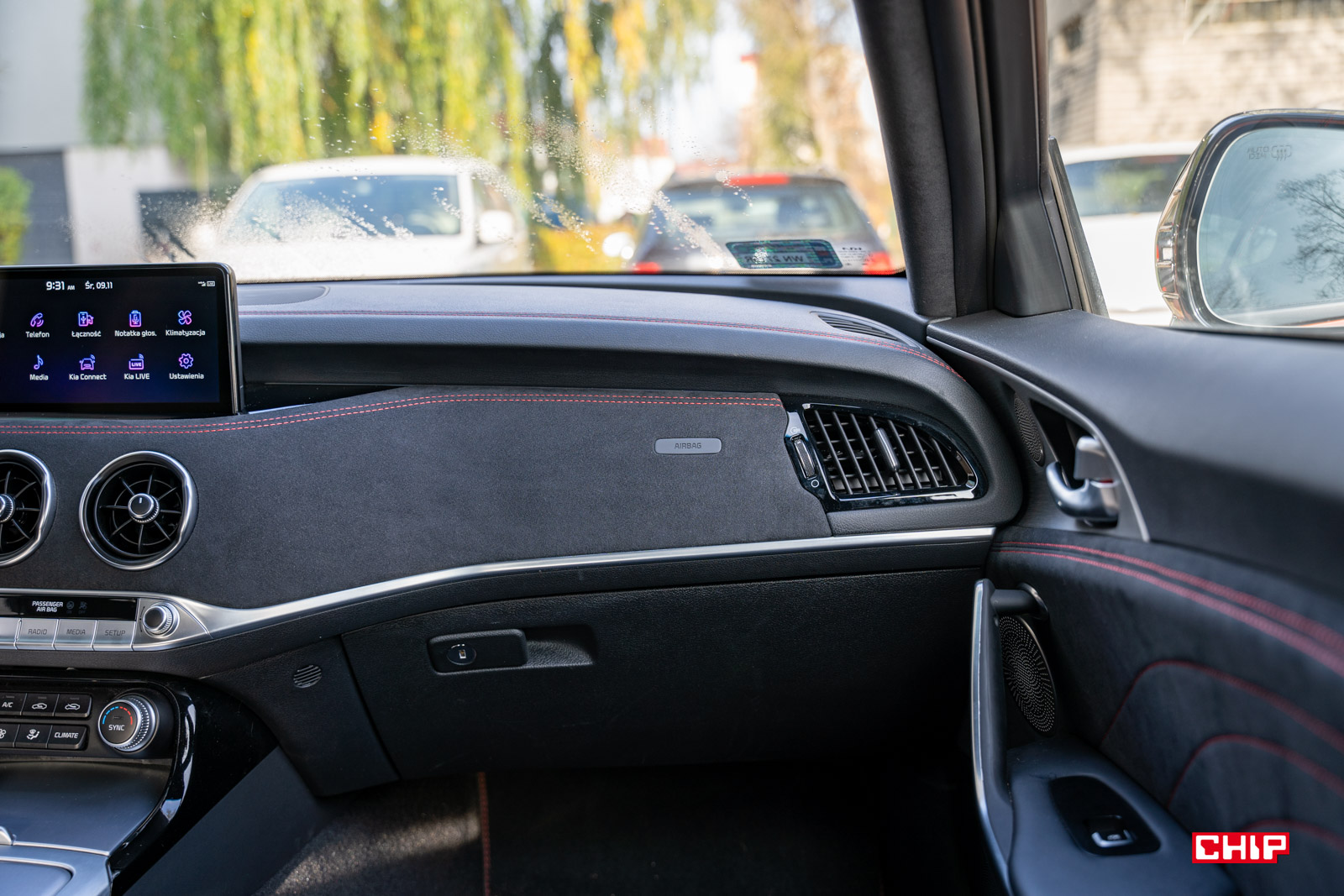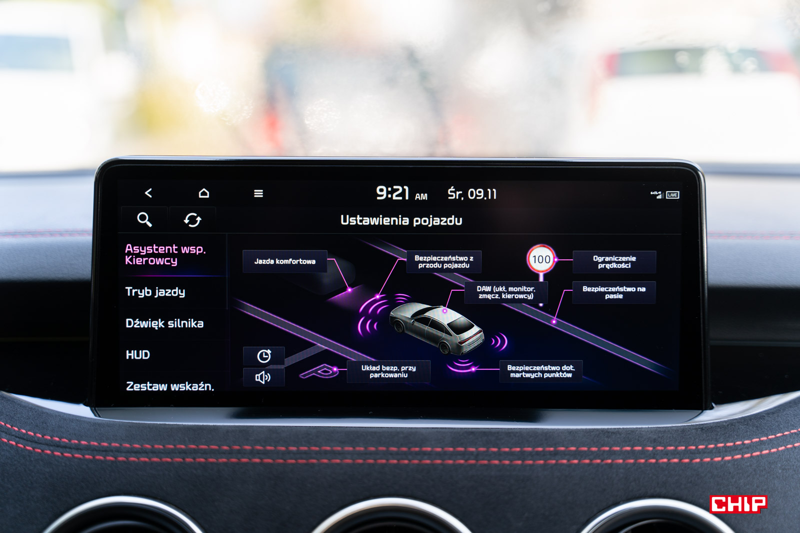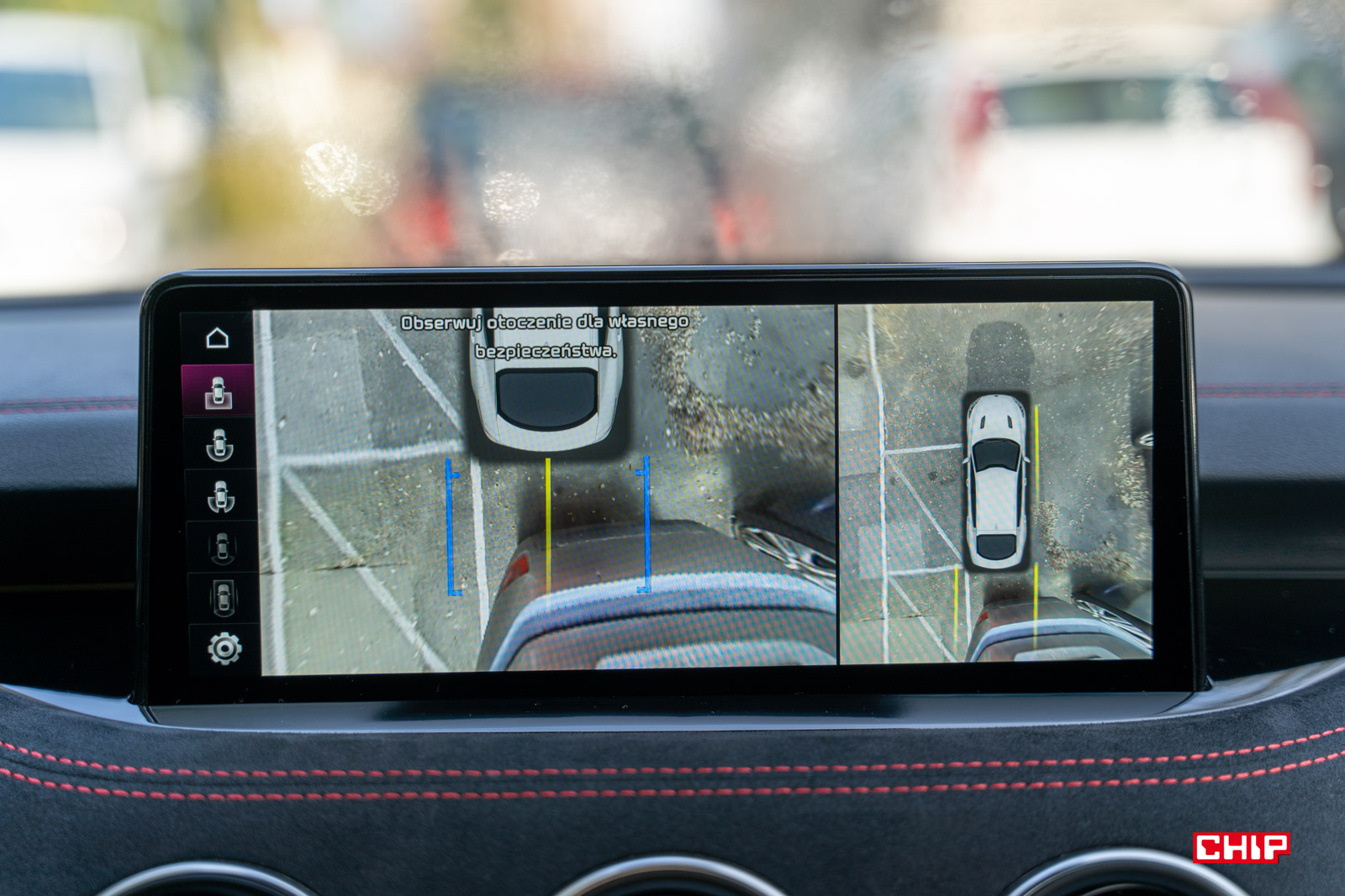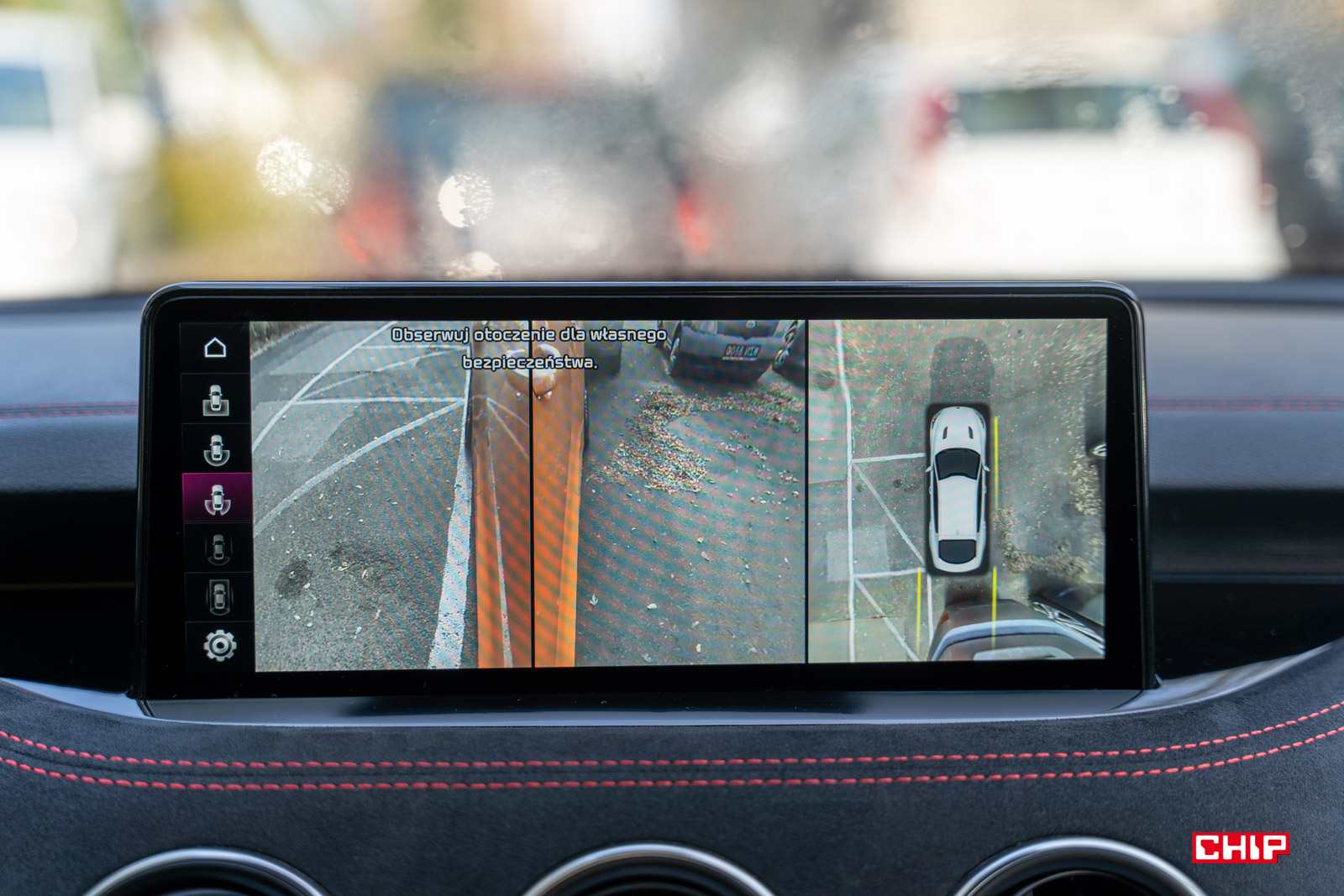 Chociaż wnętrze Stingera nie zawodzi w kwestii funkcjonalności i komfortu, ma jedną wadę. Konstrukcja samochodu połączona z pozycją za kierownicą sprawiają, że mamy tutaj do czynienia ze sporym martwym polem. Jeśli zamawiacie Stingera, koniecznie dopłaćcie za pakiet Prestige Line. Kosztuje 5000 zł, a bez niego nie będziecie mieć systemu monitorującego martwe pole. Nie jest to wygórowana cena w stosunku do wartości samochodu, a bez tego ograniczone pole widzenia będzie wymuszało bardzo zachowawczą jazdę, w szczególności w mieście. Warto też dodać, że nie jest to pierwszy lepszy system monitorujący martwe pole. Mamy tutaj oczywiście sygnał świetlny, ostrzegający nas o pojeździe znajdującym się w naszym martwym polu. Jeśli włączymy kierunkowskaz, sygnalizując chęć zmiany pasa, do tego dojdzie sygnał dźwiękowy – to tyle, jeśli chodzi o standard. W Stingerze mamy jednak dodatkową pomoc, znaną nam z innych modeli producenta. Kiedy włączycie kierunkowskaz, na wyświetlaczu centralnym zobaczycie obraz z kamery bocznej. Bardzo przydatna funkcja, zdarzyło mi się podglądać obraz, gdy manewrowałam na bardzo ciasnym parkingu. Były tam wysokie krawężniki, a ostatnią rzeczą, którą chciałam zrobić, było zarysowanie tylnej felgi. Ponieważ Stinger nie może się pochwalić imponującym promieniem skrętu, a widoczność jest, powiedzmy sobie, ograniczona, funkcja ta ułatwia życie.